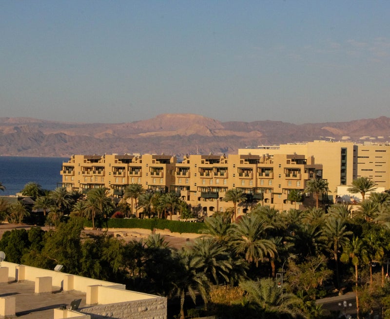 We zijn samen met Inge en Wim, een bevriend stel op pad, en we worden heel vriendelijk ontvangen bij de Receptie. We krijgen 2 kamers met uitzicht, en dat uitzicht is fantastisch. We kijken uit op de Golf van Aqaba, een zee arm van de Rode Zee. Aan de overkant zien we het gebergte van Eilat Massif in Israël.