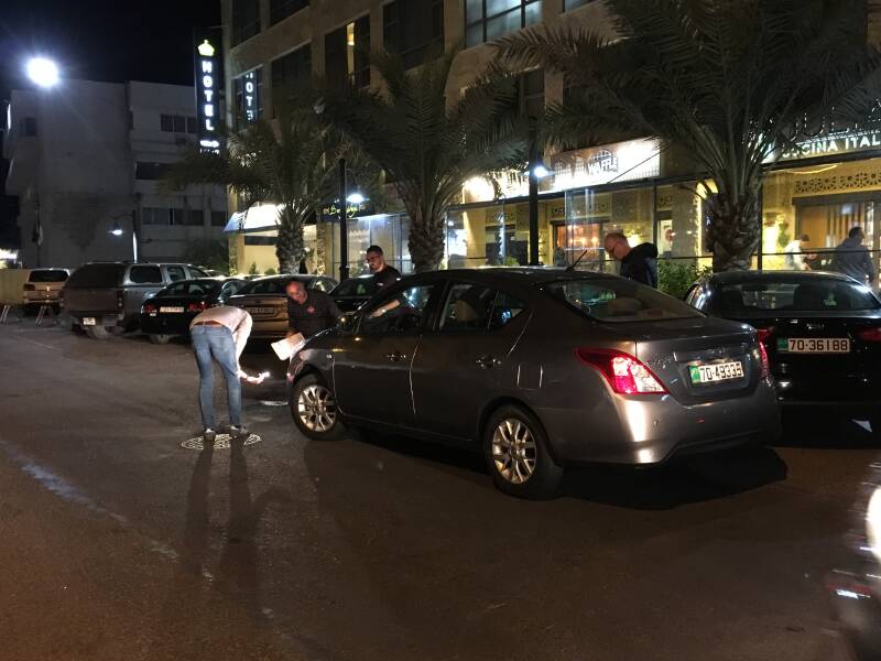 Het autoverhuur bedrijf zit praktisch naast het hotel. Enterprice in Aqaba heeft een klein kantoor, met 2 aardige medewerkers. We krijgen een middelgrote bolide mee, die grondig wordt geïnspecteerd op deuken en krassen. Het verkeer is nogal chaotisch in Jordanië, en om te voorkomen dat we andermans deuken mogen afrekenen, lopen we de gehele auto na.