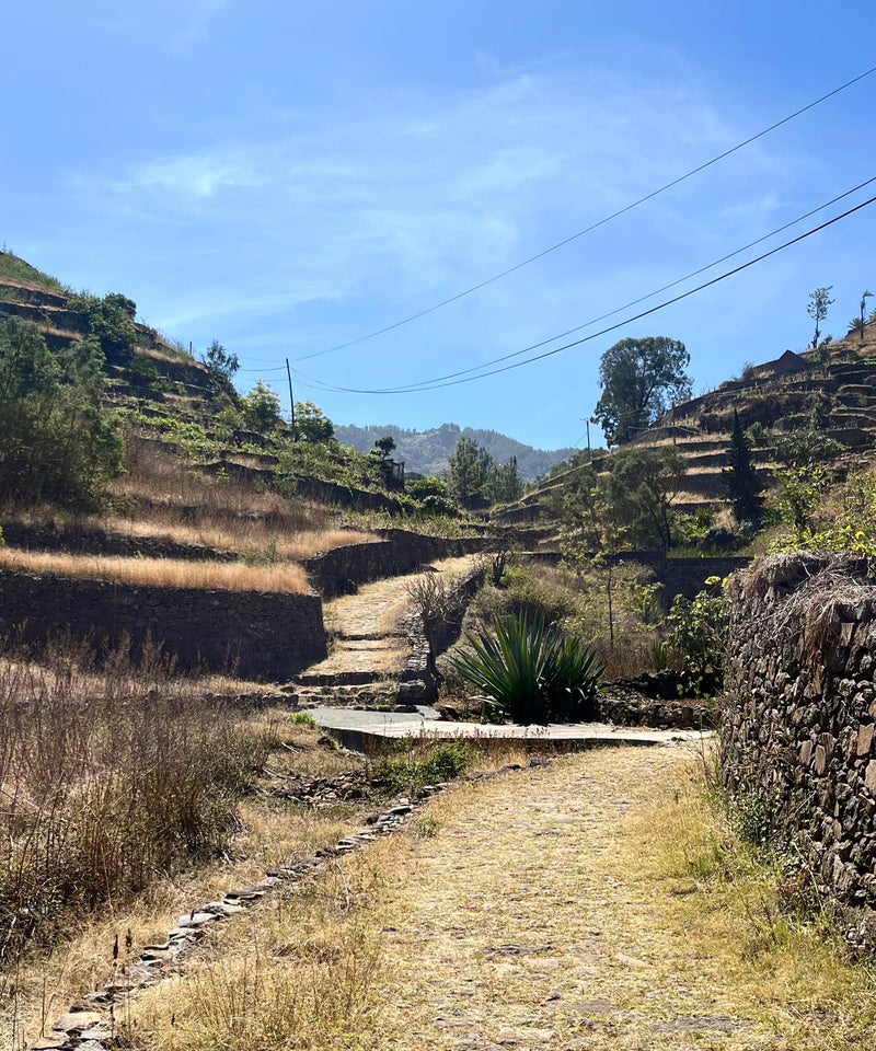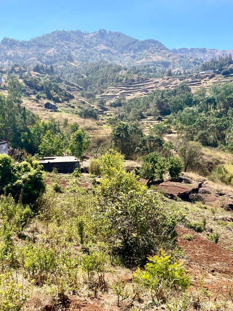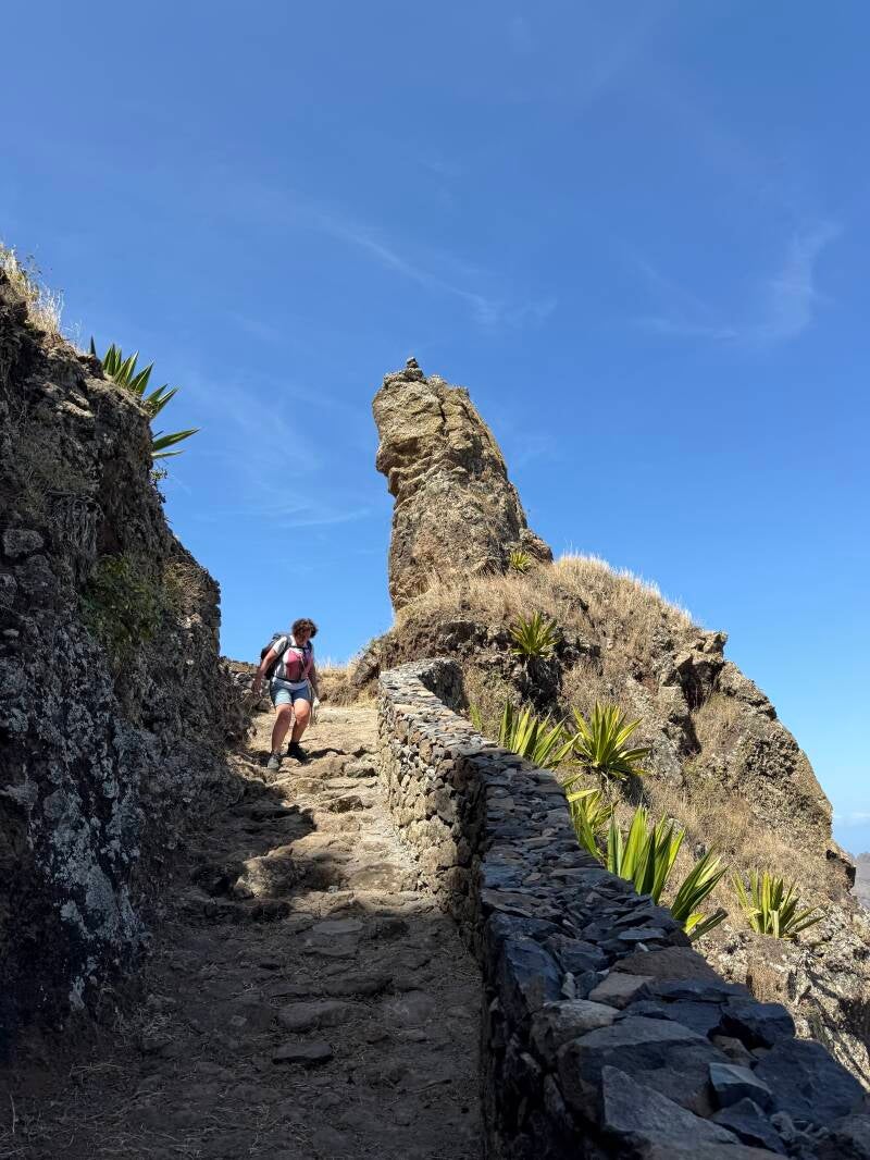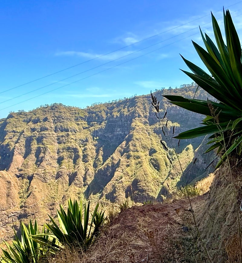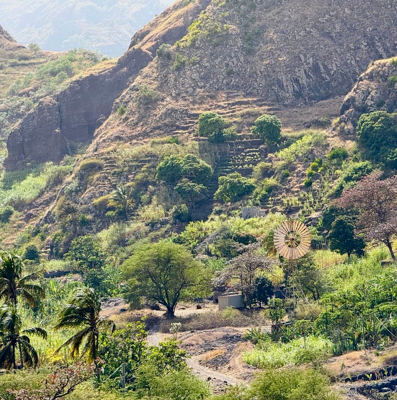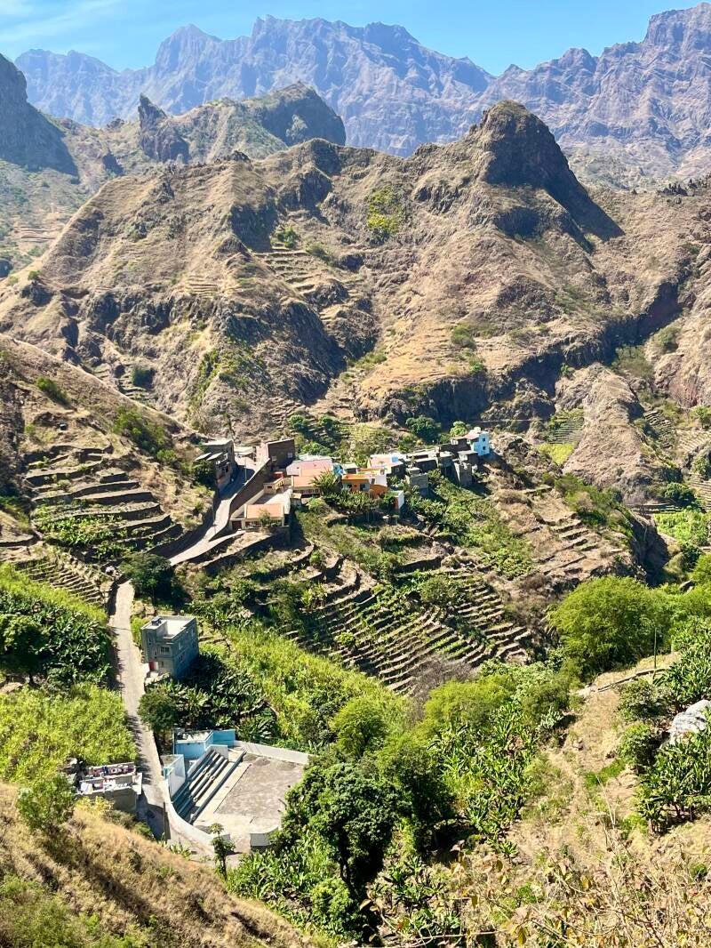 Naarmate je afdaalt, verandert het landschap van droog en rotsachtig naar groener en vruchtbaarder. De vergezichten en de ruige natuur is heel anders dan wat we op het moment van Santo Antão hebben gezicht. Gewoonweg fantastisch. Hier voel je je wel heel erg klein. De mensen die in de kleine gehuchtjes wonen maken ook gebruik van dit pad, en daar heb ik diep respect voor.