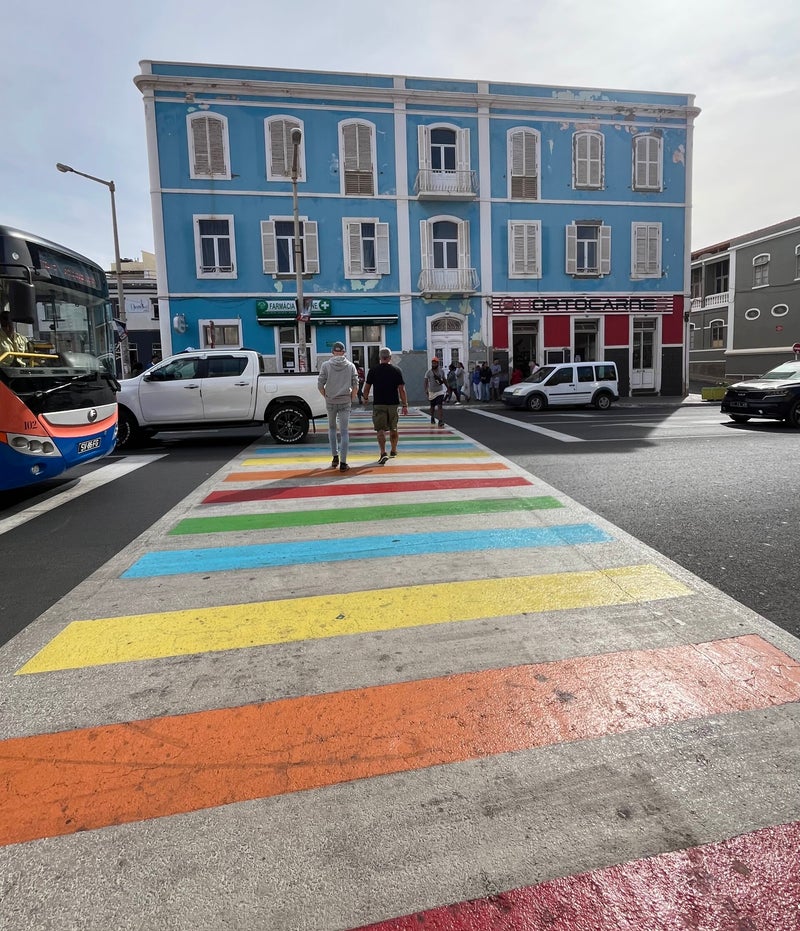 We krijgen de tip van Frederic om altijd over het zebrapad te lopen. Auto's stoppen wonderbaarlijk a la minute. Wat ik zo bijzonder vindt, is dat in de hoofdstraat de zebrapaden in regenboogkleuren zijn geschilderd. Hiermee wordt uiting gegeven aan de levendige en diverse cultuur van de stad.