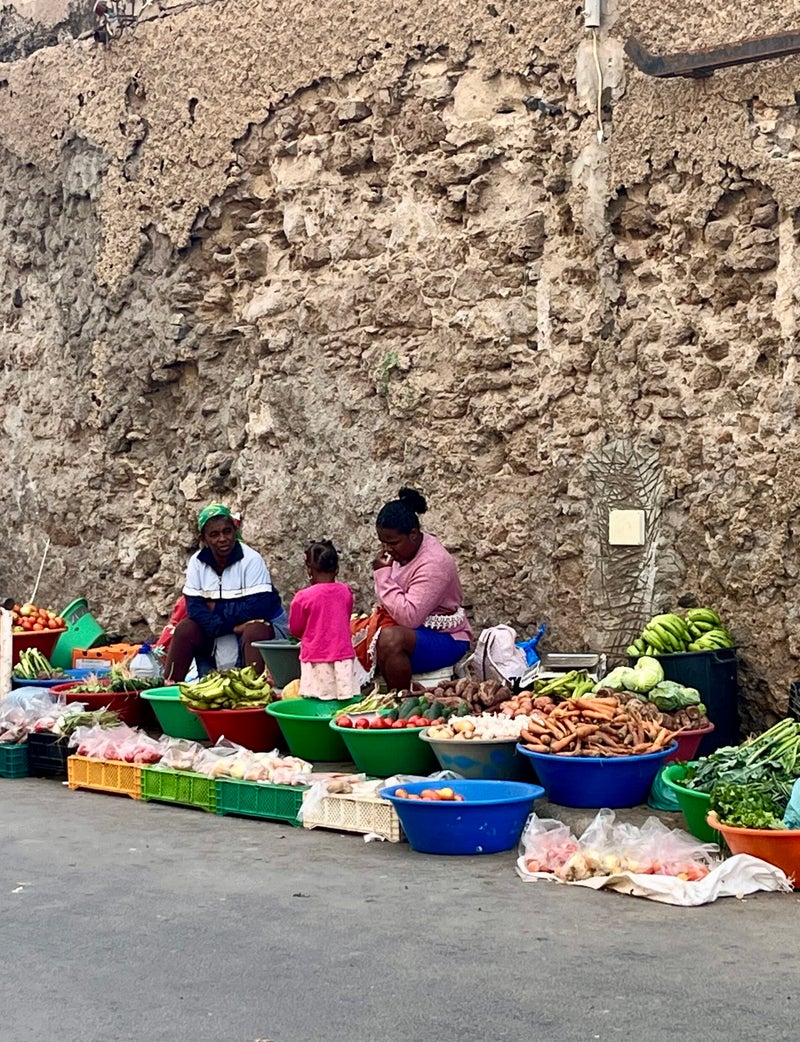 Een stukje verderop wandelen we door een druk straatje. Mindelo ligt aan zee, dus er wordt veel vis verkocht. Wanneer je als Kaapverdiaan een beetje goed verdient, kun je een kraampje huren in de grote vismarkt. Heb je dat niet, dan verkoop je de vers gevangen vis gewoon op straat. Overal zitten vrouwen vis schoon te maken in grote emmers, en het is een drukte van belang. Niks geen ijsbrokken om de boel vers te houden, nee gewoon in de zon in een bak water.