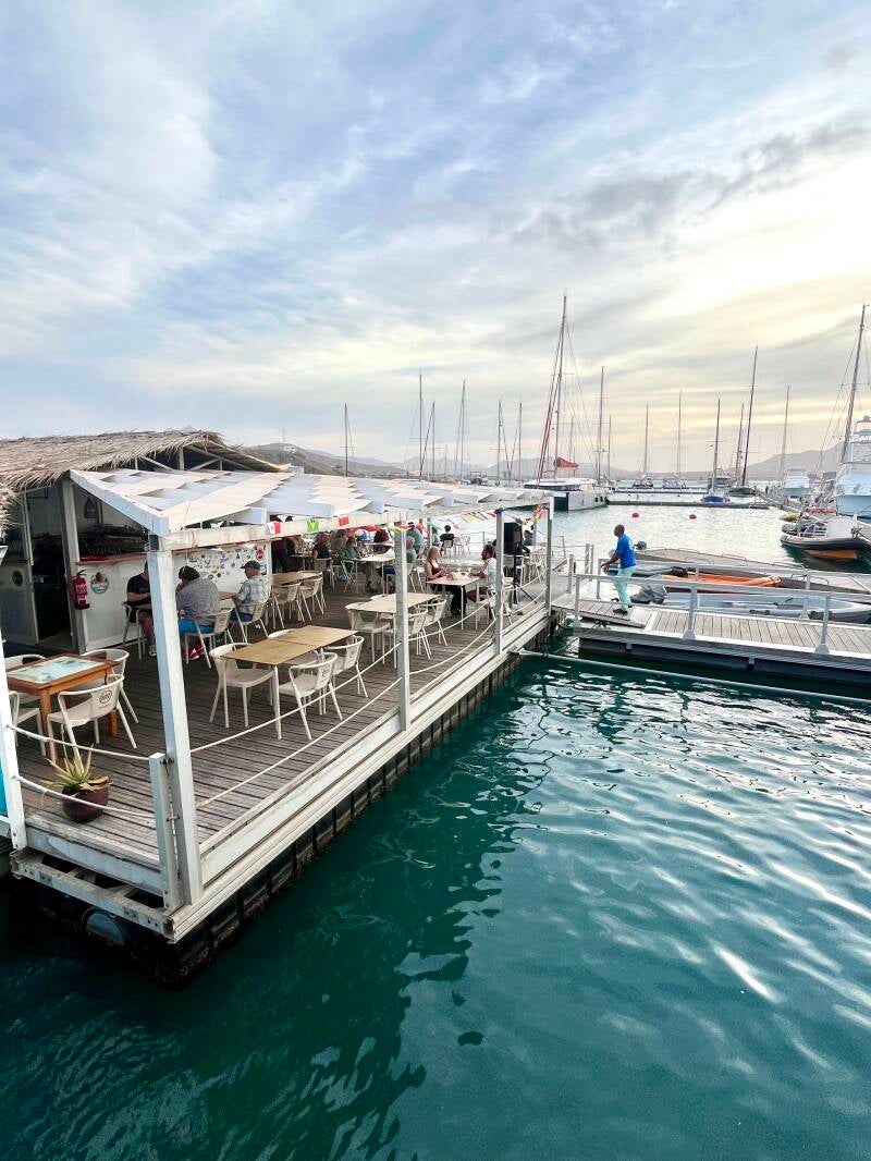 Al wandelend komen we bij de Floating Bar uit en hier nemen we afscheid van onze gastheer. We hebben ondertussen trek gekregen, en het terras van de Floating Bar is een fantastische plek voor een late lunch. Het terras ligt precies goed in de zon, en er zijn nog wat tafeltjes vrij.