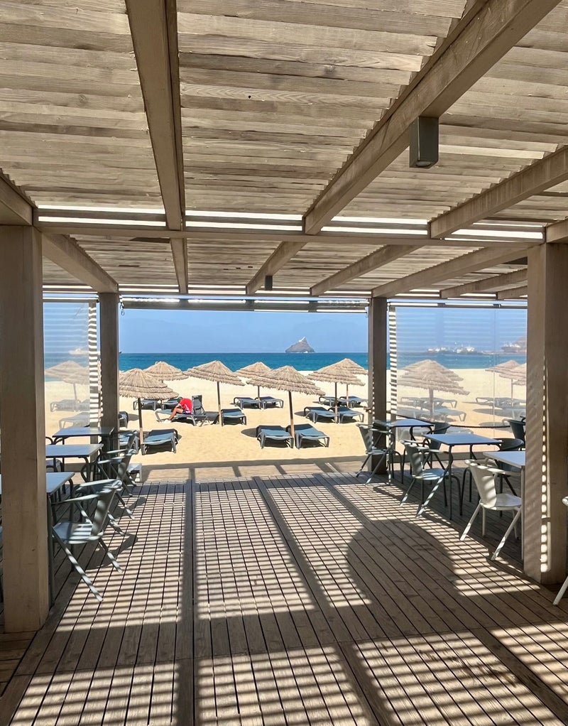 Als we de tickets binnen hebben, is het tijd voor koffie aan het mooiste strand van São Vicente. Praia da Laginha ligt in het centrum van Mindelo en het water is azuurblauw. Zooooo mooi. De strandtent Kalimba Beach Club is al open, en nadat we langs het strand gelopen hebben, ploffen we daar neer voor een koffie. Het is zo grappig om te zien hoe de honden het strand nu nog voor zichzelf hebben. Ze genieten ook lekker van het zonnetje. De Beach Bar verhuurt ligstoelen incl parasol voor € 5,00 p.p voor een halve dag.