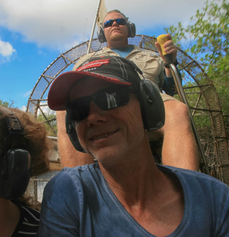 We hebben dus geen tickets gereserveerd bij Captain Jack's maar we hebben geluk. We zijn lekker vroeg en mogen met ons zessen in 1 boot om 10;30 vertrekken. Vet leuk, zo met ons eigen gezin in zo'n Airboat. Een Airboat is een kleine open boot met een platte bodem die wordt aangedreven door een soort van grote propeller. Ze zijn perfect om in ondiepe wateren te varen. Men noemt het ook wel een Fluisterboot, maar ze maken een hoop herrie. Ik weet ook niet wie op die naam gekomen is.