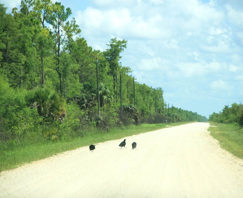 Deze kaarsrechte weg leidt je langs smalle slootjes en waterpoelen. Een bijzonder mooi stukje binnen de Everglades. Je hebt de weg helemaal voor jezelf, want hier rijdt echt helemaal niemand. Het enige wat wij onderweg tegen komen zijn deze Zwarte Gieren. Je ziet ze wel vaker in Florida, maar deze waren wel heel eigenwijs. Het duurde even voordat ze ons door lieten rijden.