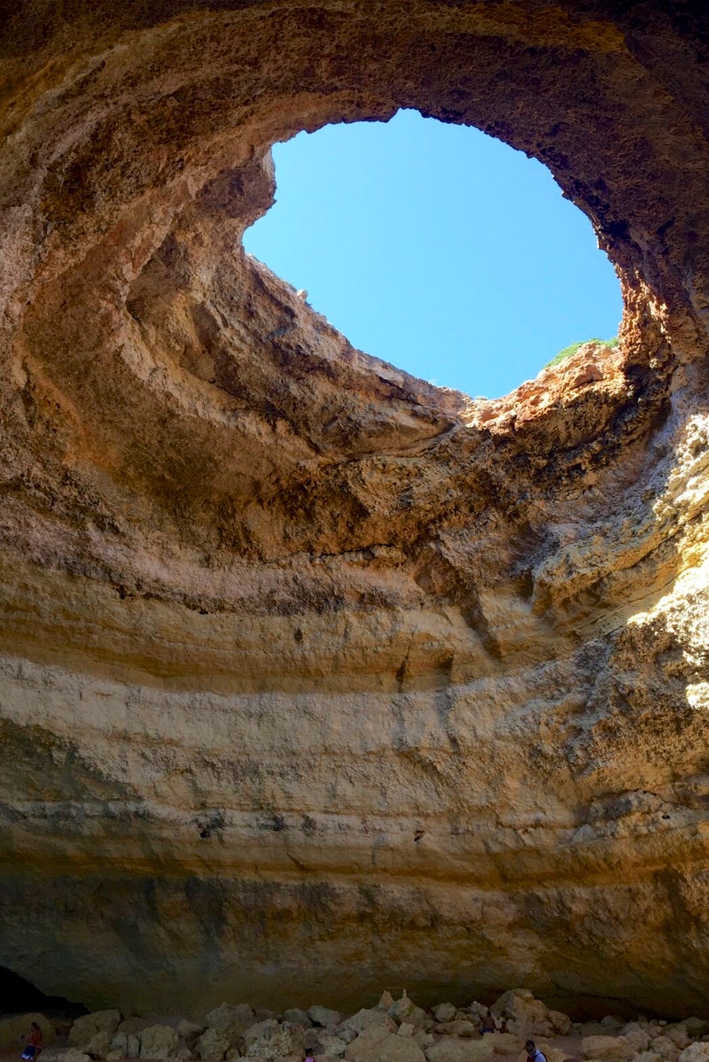 De Portugezen noemen het Praia de Benganil. Maar het is een grot en strand tegelijk eigenlijk. Deze kalkstenen grot heeft binnen in een strand van goudgeel zand. Op verschillende plekken komt het zeewater binnen, maar ook het daglicht via gaten in de rotsen. Dat maakt het zo bijzonder. Je kunt via het strand naar de grot wandelen, en dan bovenin het gat kijken, maar mooier blijft het via het water binnen te varen. Het ligt valt nu precies op het kleine strandje als wij binnen varen, en dat geeft een magisch effect.