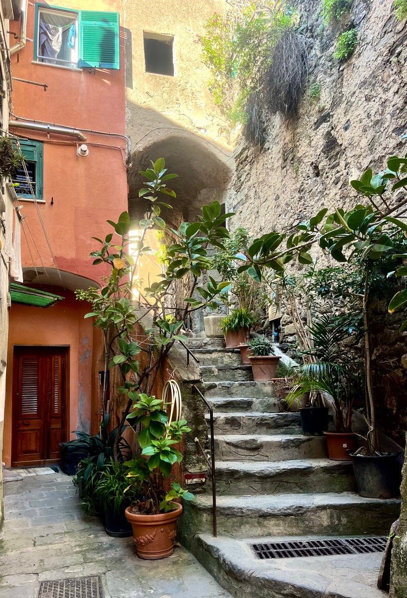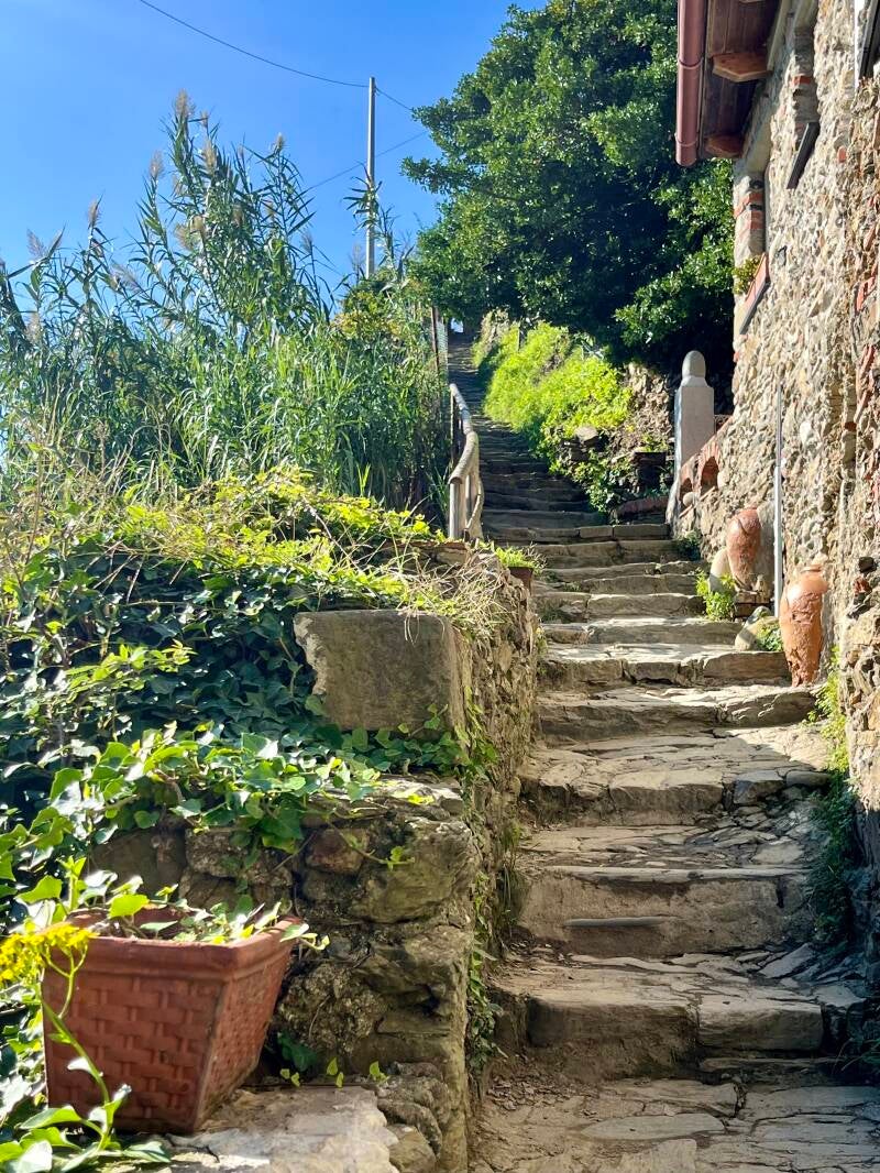 Een pittiger pad, met prachtige uitzichten op terrassen vol wijngaarden en olijfbomen. Deze route start ook aan de hoofdstraat in Vernazza. Naast de Farmacia leiden de trappen je meteen ophoog. Wij hebben deze hike een klein stukje omhoog gelopen in Vernazza, omdat de steegjes zo mooi zijn.
