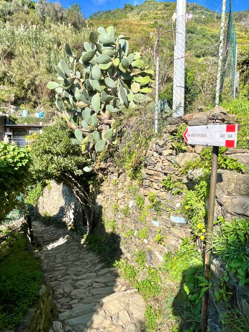 Het pad is gemakkelijker met minder trappen als je van Vernazza naar Monterosso loopt. Als je in Monterosso begint, begint het pad met een lange trap, maar langs het pad heb je een geweldig uitzicht op Vernazza.