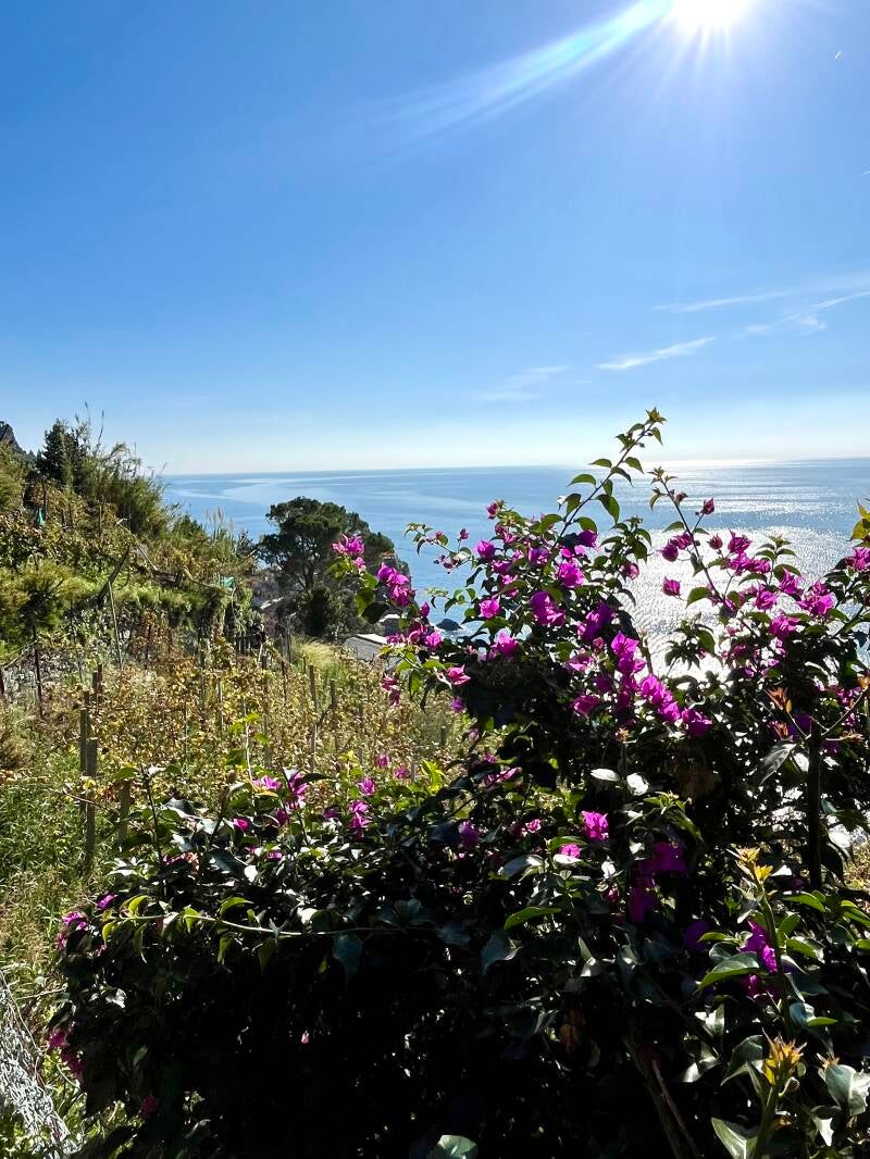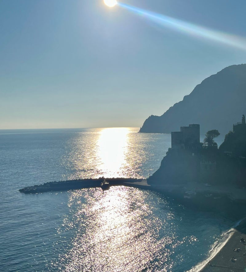 Vanaf het uitzichtpunt wandelen we verder en hebben continu mooie uitzichten over het water en zie je af en toe een glimp van het dorpje Monterosso. Daar eindigt deze wandeling, maar we zijn er nog lang niet.