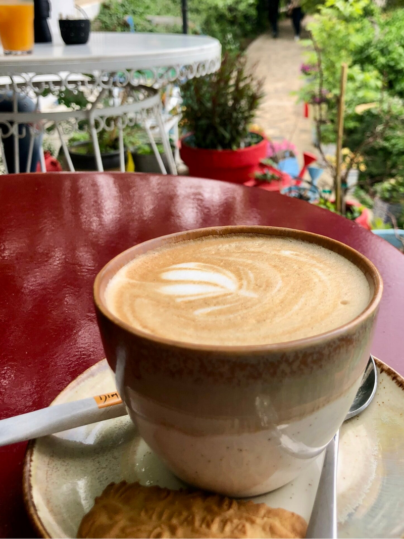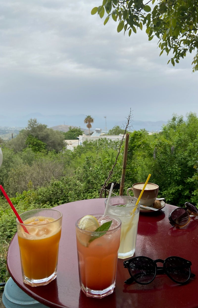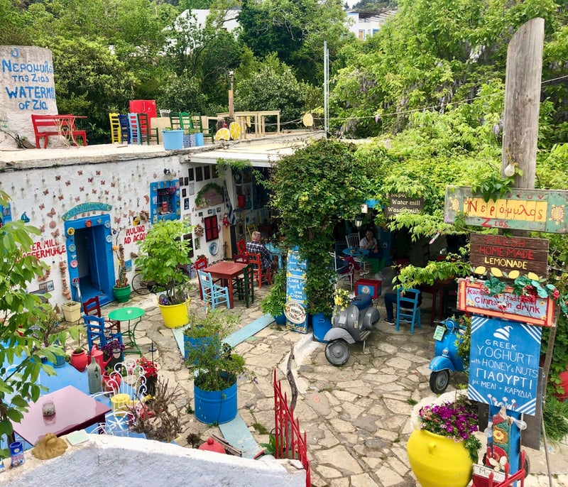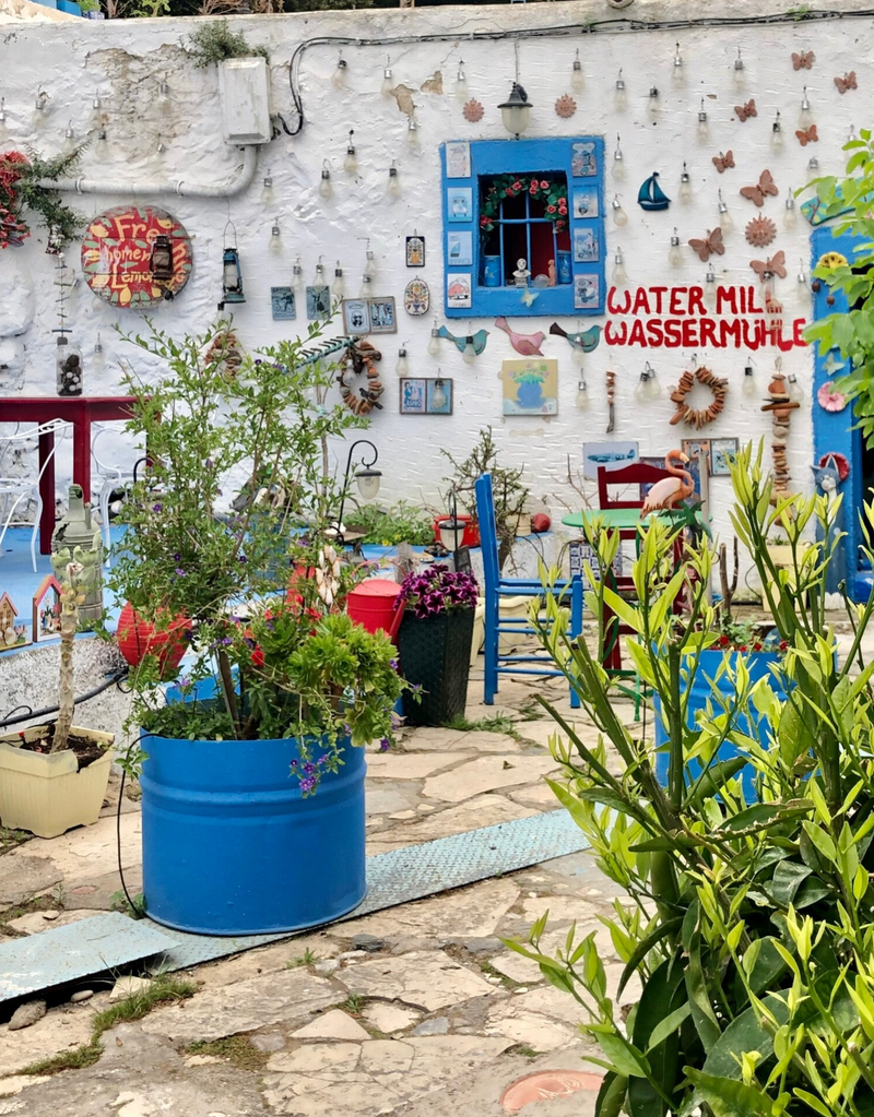 Het is maar een klein dorpje, dus we zijn snel rond. Natuurlijk gaan we op een van de sfeervolle terrasjes zitten. We komen uit bij The Watermill of Zia. Het cafe is absoluut een plaatje! Vrolijke stoeltjes. geinige bordjes, overal staat wel wat.
