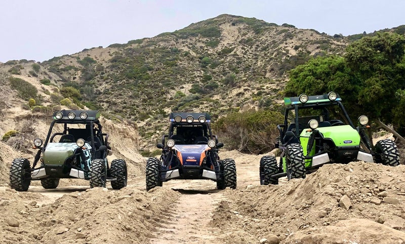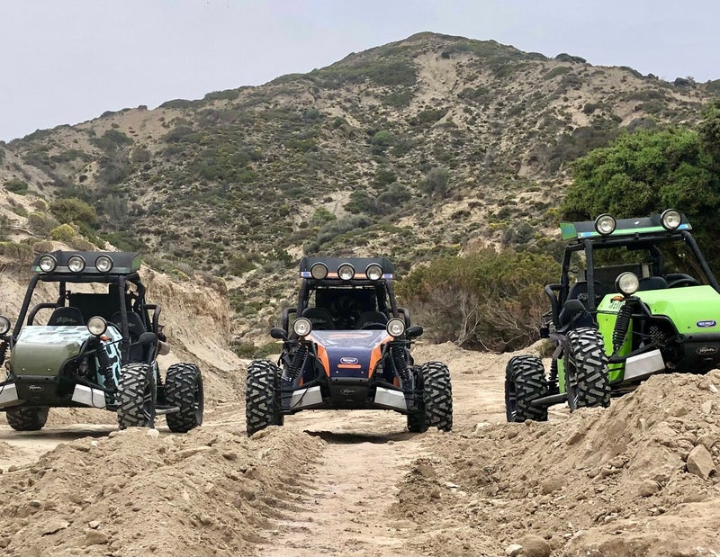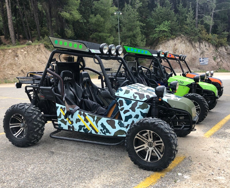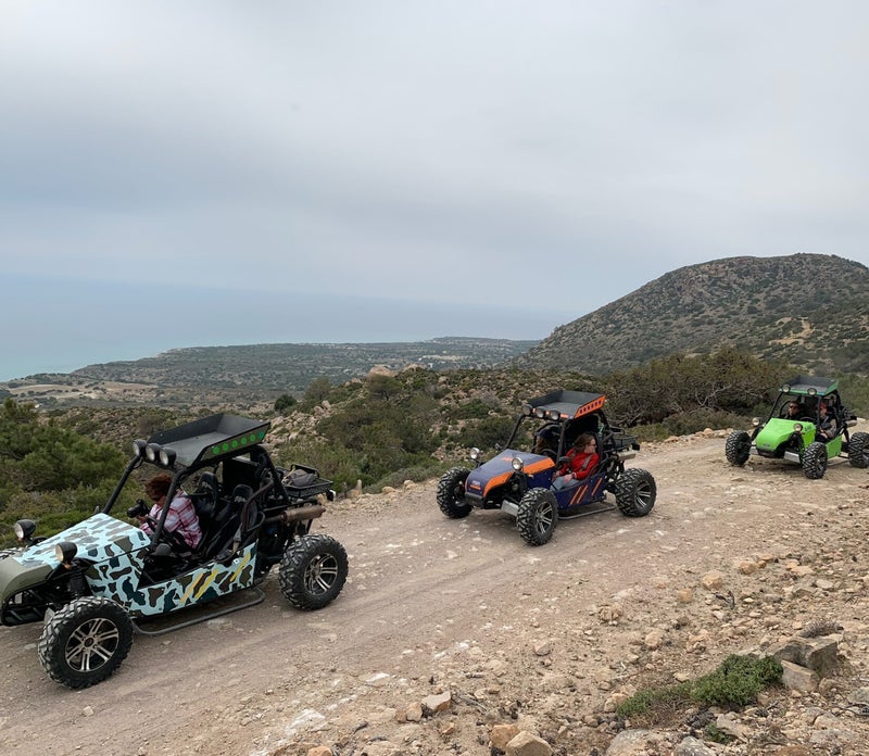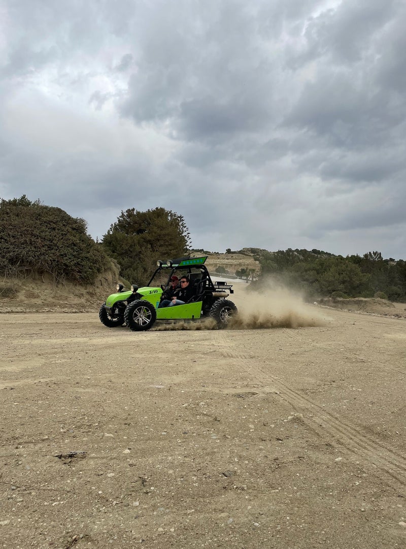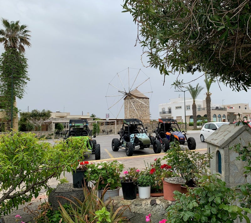 Vlakbij het Apollon Hotel zit het Nederlandse verhuur bedrijf Moto-Harley. De naam alleen al is goed. Hier kun je naast fietsen ook quads, scooters, motors, buggies huren. We hebben niks gereserveerd, dus het is spannend of we voor ons zessen iets kunnen huren. Het weer is in mei niet super stabiel, en we hadden geen zin om in de regen gaan toeren. Vandaar dat we niks hebben geboekt. Het is bewolkt vandaag maar wel droog. Een perfecte dag voor een stoere activiteit. Aangekomen bij Moto-Harley, zien we 2 vet mooie Buggies buiten staan. Hier willen we wel een dagje mee over het eiland crossen. Gelukkig zijn er 3 in de verhuur en we kunnen er meteen mee op weg. Perfect.