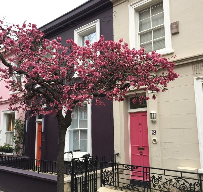 Notting Hill staat ook bekent om z'n bloesem bomen. Zeker in het voorjaar is dat zo mooi wanneer ze roze bloeien. Samen met de kleurrijke huizen wordt het een vrolijke wijk.