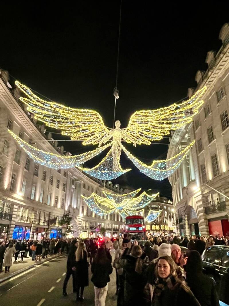 Loop via Piccadilly Circus naar Regent Street. Dit is een van de meest iconische plekken in Londen voor kerstverlichting, met enorme verlichte engelen die boven de straat zweven. Vanaf Piccadilly Circus heb je het mooiste overzicht over de 3 straten. Dit is ook de meest drukke locatie tijdens de feestdagen. -
