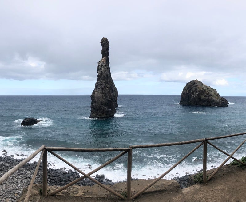 Na deze stop vervolgen we onze weg naar beneden richting zee. De weg slingert prachtig door kleine dorpjes. Wanneer je bijna onderaan bent, doemt in de verte een hoge pilaar op. Het blijken de zwarte rotsachtige eilanden Ilheus da Ribeira en Janela te zijn.