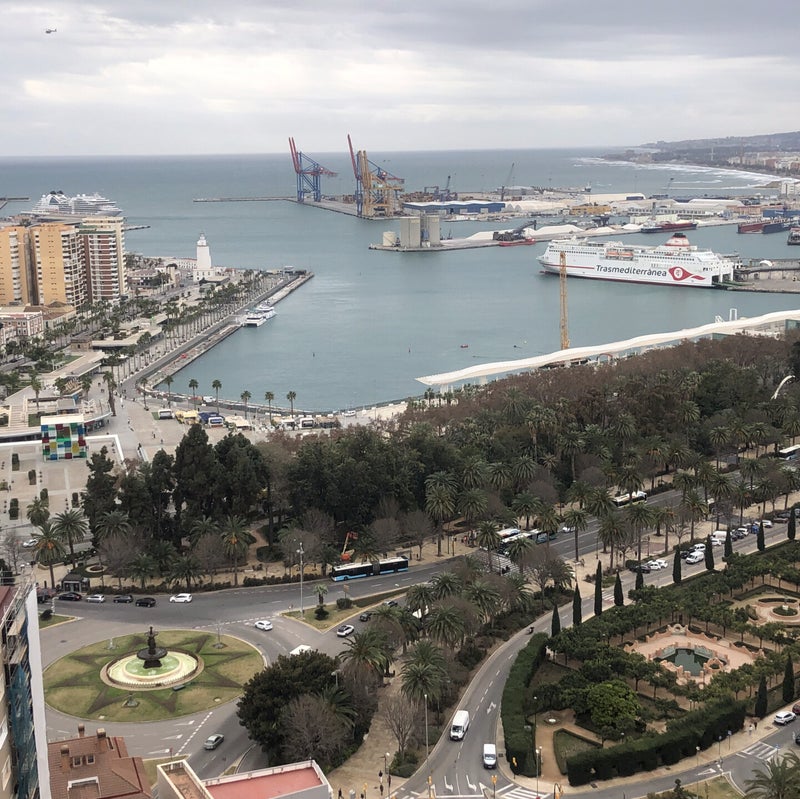 Na deze geweldige middag, wilden we een drankje doen op het dakterras van Alcazaba Premium Hostel. De lift omhoog is al leuk, dus we verheugen ons erg op het uitzicht. Jammer genoeg, is het terras helemaal vol, en zijn we net zo snel weer beneden, als dat we boven waren. Het uitzicht was idd mooi, maar niet zo indrukwekkend als dat we hadden gedacht. We zoeken een terras in de zon, en komen via het Teatro Cervantes, Picasso Museum en Calle Santa Maria in de buurt van de haven terecht. Wat we wel bijzonder vinden, is dat een biertje overal in een wijnglas wordt geschonken. Nog steeds geen idee, of dat typisch is voor Malaga.