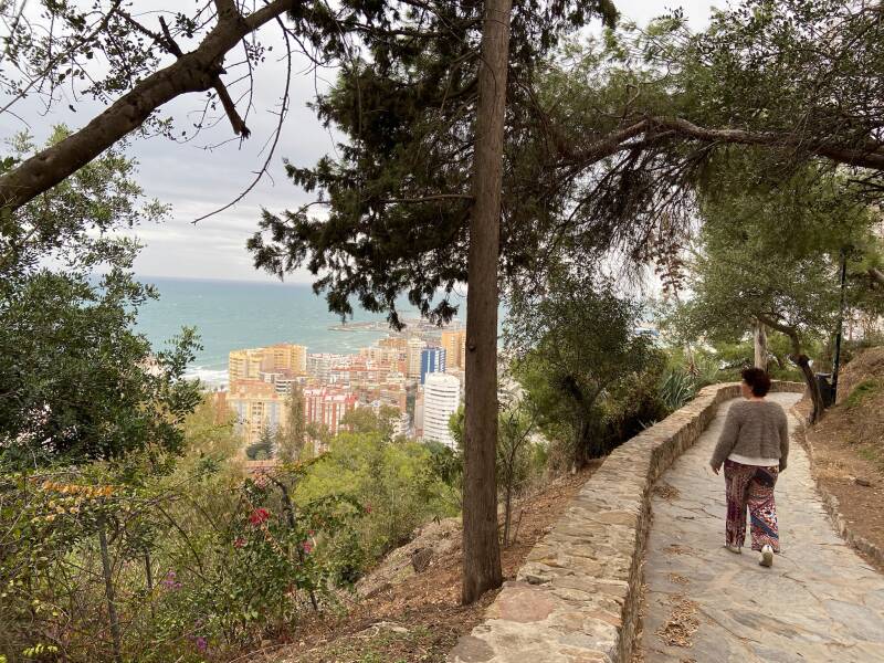 Wanneer je in Malaga bent, kunt je niet om het Gibralfaro kasteel heen. Het ligt hoog op een heuvel, en is de belangrijkste bezienswaardigheid van de stad. Vanuit de binnenstad kun je omhoog klimmen, maar er is ook een noordroute. Vanuit ons appartement is de noordroute de beste manier om er te komen. Het grote voordeel van de noordelijke route is, dat je niet hoeft te klimmen. Je wandelt door een woonwijk, en daarna kom je op het wandelpad Paraje Natural. Deze route is prachtig, en midden in de natuur. Je komt tevens vanzelf langs het Mirador de Gibralfaro. Dit is het uitzichtpunt dat een fantastisch uitzicht geeft over de stad en Arena waar de Stierengevechten werden gehouden.