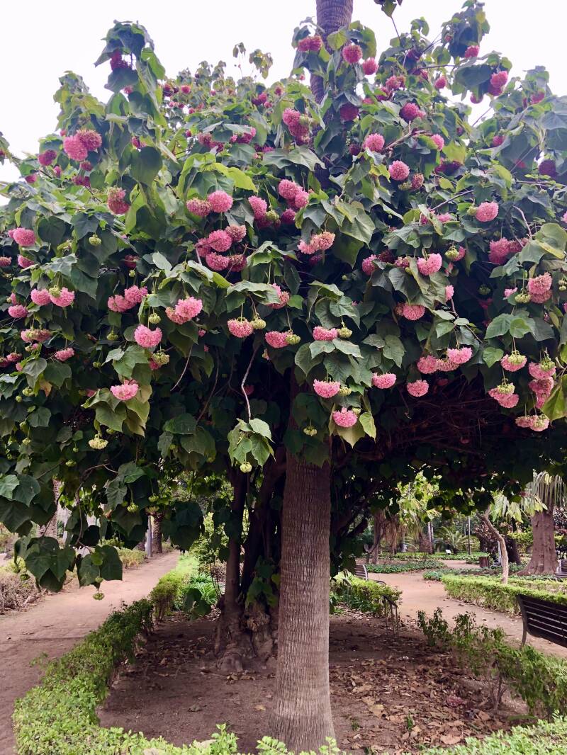 Van het Museum Pompidou steken we de straat over, en wandelen we door het Parque de Malaga. Het staat er vol met palmbomen en de bloemen van de Strelitzia vallen enorm op. Ik vind dat altijd zo bijzonder.... Al onze kamerplanten groeien in de Zuid- Europa gewoon overal! En ook nog eens vele malen groter en mooier. Het park zal in de zomer heerlijk verkoelend werken, als het warm is. Bij het Ayuntamiento de Málaga ( gemeentehuis) steken we de drukke Paseo del Parque weg over en komen in de Jardines de Pedro Luis Alonso. Deze rozentuin hoort bij het gemeentehuis, maar nu bloeit er natuurlijk niks.