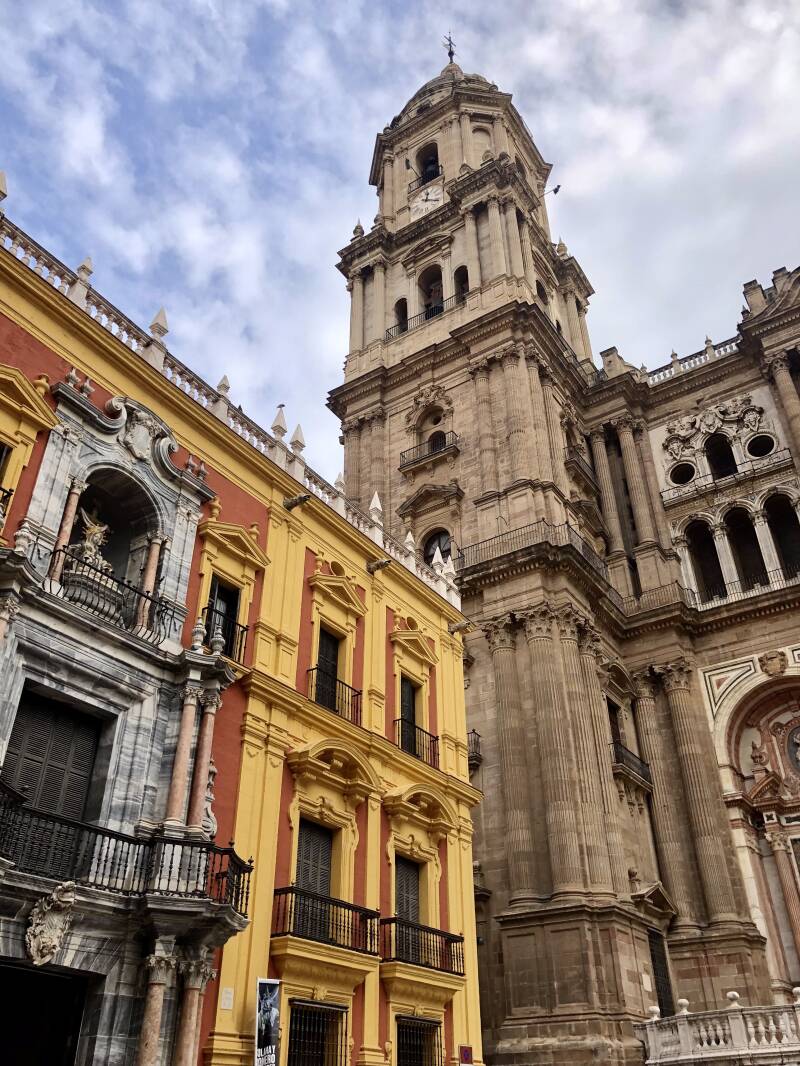 Vanuit het Plaza de las Flores is het een korte wandeling naar Plaza del Obispo. Dit plein maakt indruk. Je vindt er bisschoppelijk paleis . Het prachtige monumentale gele gebouw met een kleurrijke, Spaanse barokke gevel. Als je van Gaudi houdt, zul je zijn stijl meteen herkennen. En hier staat natuurlijk de grote Catedral de Málaga. De machtige toren van de Catedral te zien vanaf vele plekken in de stad. Er is 1 toren gebouwd, terwijl er 2 in planning lagen. Je kunt duidelijk zien waar de andere toren gepland was. In het midden van het plein staat een fontein, waar werkelijk iedereen foto's maakt. Wij ook! Je kunt de Catedral op werkdagen bezoeken en op maandag, dinsdag, woensdag en donderdag kun je tussen 9:00 en 10:00 uur gratis naar binnen. Het is de moeite waard.