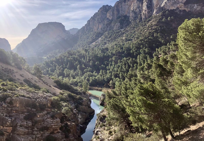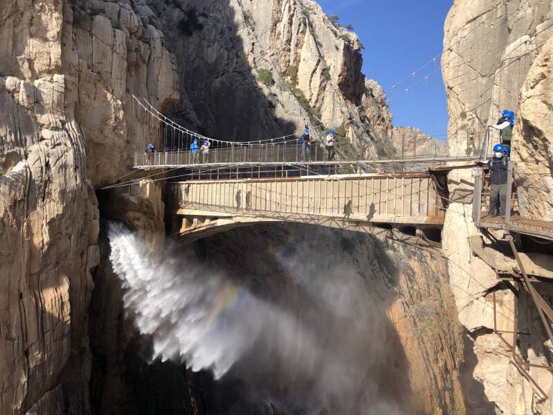 Het wandelpad is 7,5 kilometer lang, door de Desfiladero de los Gaitanes kloof. El Caminito droeg ooit de titel van het gevaarlijkste wandelpad in Europa, en één van de gevaarlijkste ter wereld. Dat is het nu helemaal niet meer. Heb je hoogtevrees, dan is deze tocht misschien niet zo'n heel goed idee, want het pad ligt wel hoog. Onze gids verteld enthousiast over alles wat we zien, en neemt de tijd zodat iedereen foto's kan maken. De kleuren van de rotsen veranderen continu van kleur, door de opkomende zon, en het water is op sommige plekken knalgroen. Adembenemend mooi. Halverwege de tocht is er tijd voor een pauze. Je moet wel zelf eten en drinken meenemen, want onderweg kun je niets kopen. Ook zijn er geen toiletten. De plek waar we stoppen geeft een fantastisch uitzicht over de vallei. We worden er stil van.
