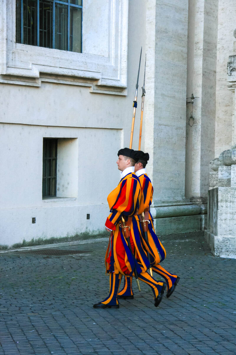 De Zwitserse garde bewaakt nog altijd de Paus, de Sint Pieter en zijn ontelbare schatten. Maar de specifieke kleding die dit leger draagt is zo kleurrijk en grappig. Super leuk dat we het toevallig meemaakten. Ik ben ook geen officiële tijden tegen gekomen, op welk tijdstip ze deze ceremonie opvoeren.