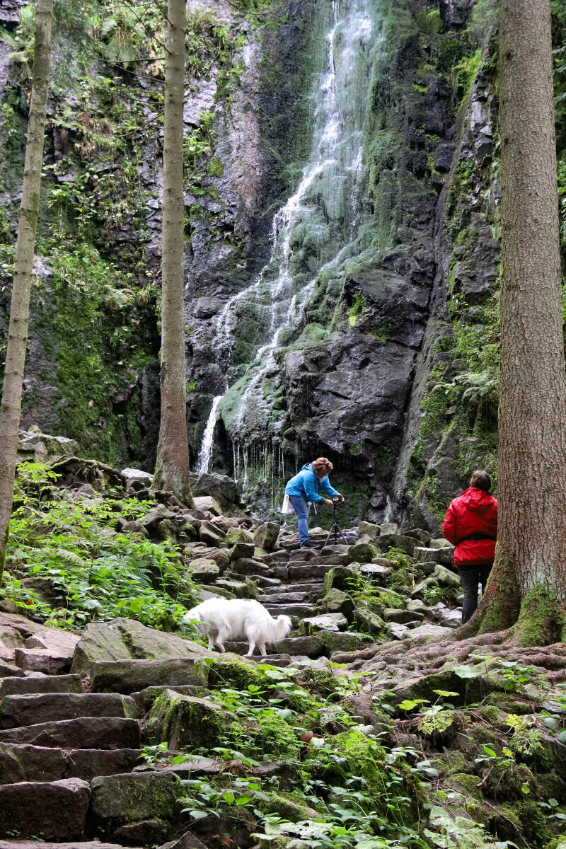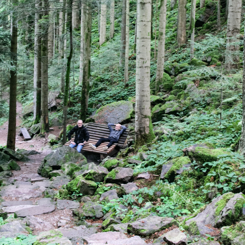 Wij overnachten in Bad Rippoldsau-Schapbach in een Gästehaus en de Burgbachwaterval ligt maar op 10 minuten rijden. Je zou zelfs vanaf Gästehaus Heimerberg kunnen lopen, want het is maar 6,5 km. De waterval ligt net buiten het dorp. De parkeerplaats is duidelijk aangegeven en daarna loop je een vlak pad naar de start. Ook hier mag je je van te voren moed in drinken, want er staat weer een grappig drankhuisje. Het staat helemaal vol met "Schaps"