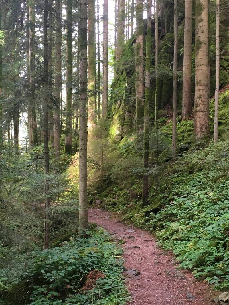 Vanaf het drankhuisje wandel je ongeveer een 1 km omhoog. Het pad ligt verscholen in het groen. Het is prachtig en heel erg stil. Een heerlijke wandeling.
