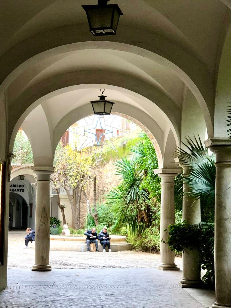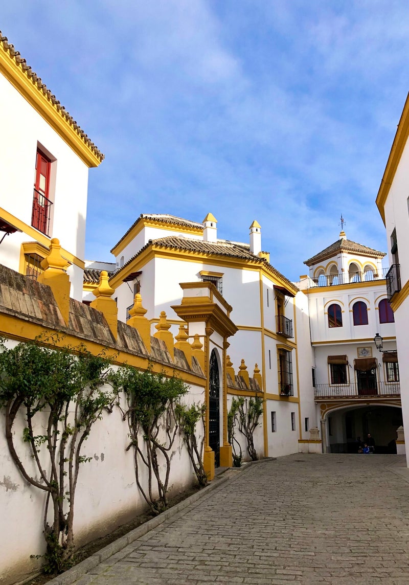 Wanneer je de Cathedral uitloopt, ben je in de meest fotogenieke wijk van Sevilla: Santa Cruz. Het is gebouwd op de fundamenten van de oude joodse wijk, en is één van de mooiste wijken van Sevilla. Smalle bochtige straatjes, witte huisjes, gietijzeren balkons en pleintjes met sinaasappelbomen. laat Google Maps maar uit, en sla links en rechts af. Heerlijk om hier rond te dwalen. Overdag is het niet zo druk, maar 's avonds stromen de terrasjes vol.