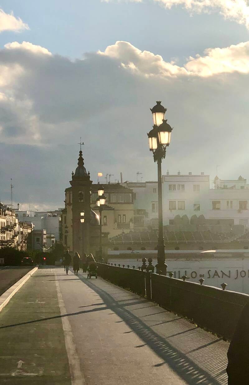 Wanneer je bij de Puente de Isabel II brug bent, ook wel bekend als de Triana-burg, heb je een prachtig uitzicht op de wijk Triana. De brug verbindt het centrum van Sevilla met Triana. De bouw van de brug werd in 1852 afgerond, en het is de oudste metalen brug in Spanje. Ik zoek een plaatsje om te zitten op een van de muurtjes, om samen met vele anderen te genieten van de laatste zonnestralen. Ik vind het een heerlijk plekje.