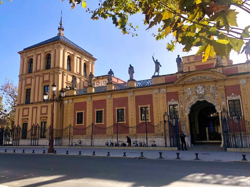 Zoals ik al schreef, wil ik vandaag nog naar het Plaza España, zeker nu de zon schijnt. Google Maps zegt me dat ik opnieuw een half uur mag lopen. M'n stappenteller maakt overuren deze dagen. Ik loop opnieuw over het Puerta Jerez. en de fontein schittert nu in de middagzon. Iets later kom ik langs het Palacio de San Telmo. Hier neem ik wel even de tijd voor. Wat een schitterend paleis is dit. Het paleis is alleen onder begeleiding te bezoeken, dus even naar binnen wippen zit er niet in.