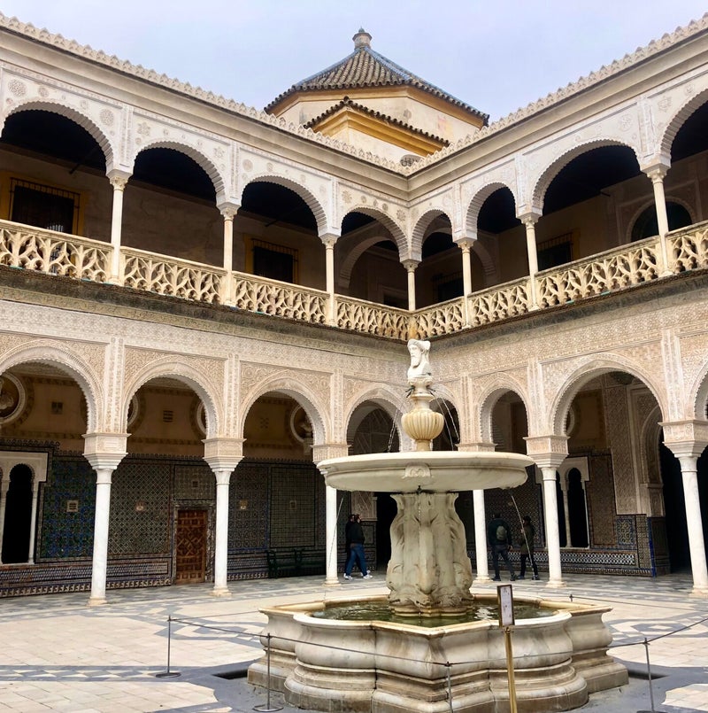 Na mijn bezoek aan de toren wandel ik het oude centrum in en kom uit bij het Jerez plein. Dit is een schitterend plein om te zien, vooral door het luxe hotel Alfonso XIII. De Hispalis fontein in het midden is een echte erecatcher. Hier ga ik lekker in het zonnetje zitten met een Starbucks Coffee om te genieten van alles wat er om me heen gebeurt.