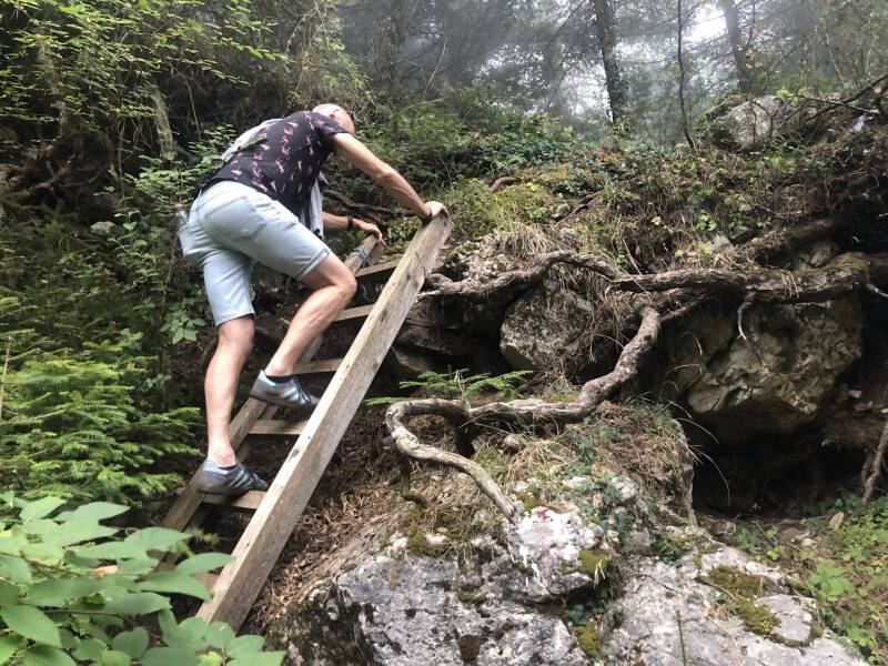 Omdat een stuk pad is weggevallen, moeten we een trapje beklimmen. Hilarisch, waar vindt je nou zoiets. Aan het einde van de route, staat een blauwe keet. Een grappig gezicht zo midden in het bos. Het lijkt alsof er af en toe iemand slaapt, want er ligt een matras en wat lege blikjes bier. Terug gekomen bij de doorgaande weg, lunchen we bij het Gole Steakhouse, Wij vinden het geen aanrader. Mijn pasta is koud, en Arjan had een steak besteld, maar het is alleen maar bot. Deze mag je van ons overslaan.
