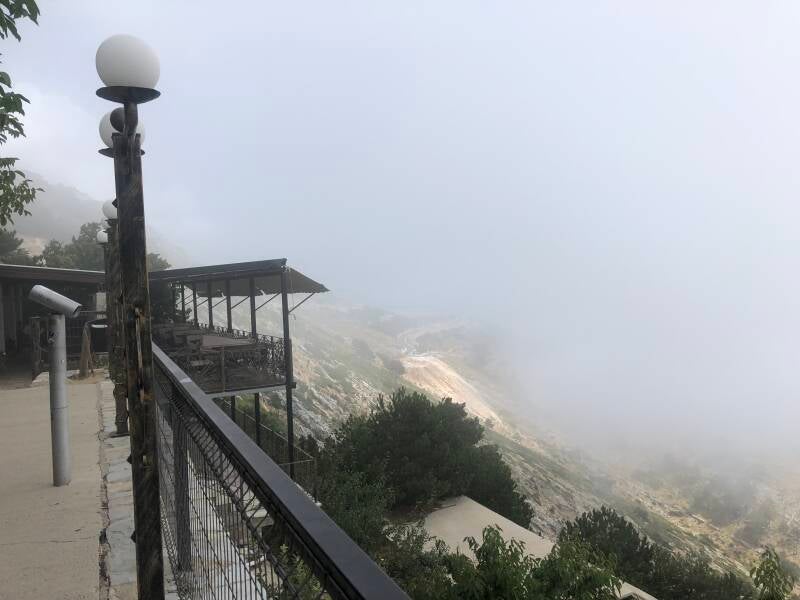 We stappen opnieuw in de auto en rijden door naar het Panorama Punt. We hebben ontzettend geluk, want de Llogara Pass leidt ons naar het hoogste punt, en de bewolking blijft in het bos hangen. Voor het eerst krijgen we een geweldig uitzicht op de kust beneden ons.