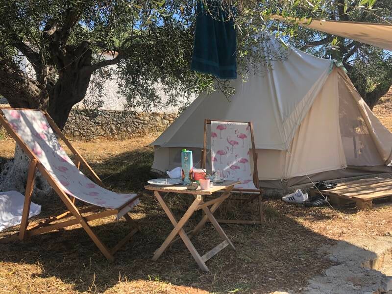 Wij rijden verder naar onze eindbestemming. Mysterious Glamping, net buiten het plaatsje Vuno. Hier verhuurt Mirjana piramide tenten, ingericht met bedden en een koelkastje. Buiten staan gezellig stoeltjes en hangt er een hangmat. Een geweldige plek onder eeuwenoude olijfbomen. Ze is er zelf niet, maar het hek is open, en de sleutel van de tent ligt klaar, samen met een paar drankjes. Naast het toiletgebouw is een compleet ingerichte keuken, en je kunt er zelfs je was doen. Overal is aan gedacht, en deze plek is echt een aanrader als je van kamperen houdt. Mirjana verhuurt haar tenten via Airbnb