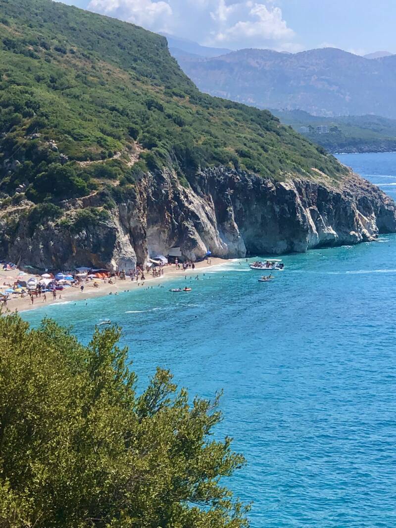 We rijden verder om te gaan lunchen in Borsh bij Ujëvara e Borshit. Het water wordt nog blauwer naarmate we dichterbij komen bij Borsh. Dit stukje Albanese Riviera is erg populair bij vakantiegangers. Borsh heeft een ontzettend mooi strand, en vanuit hier zit je heel centraal om de allerlei uitstapjes te maken. We stoppen dan ook een keer extra, want het uitzicht is prachtig.
