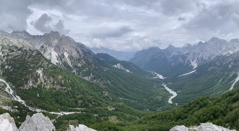 Halverwege kom je uit op de top bij het Valbonië - Theth Viewpoint. Dit uitzicht is geweldig en het is ineens druk. Je kunt nl ook vanaf Theth naar Valbona wandelen. De route is dan andersom. Bij het viewpoint komen de wandelaars elkaar dan tegen. We zijn ontzettend blij, dat het droog gebleven is vandaag. Bij regen of wat mistiger weer, zal zo'n mooi punt er zeker anders uitzien. Wanneer de zon schijnt, zal het waarschijnlijk nog mooier zijn.