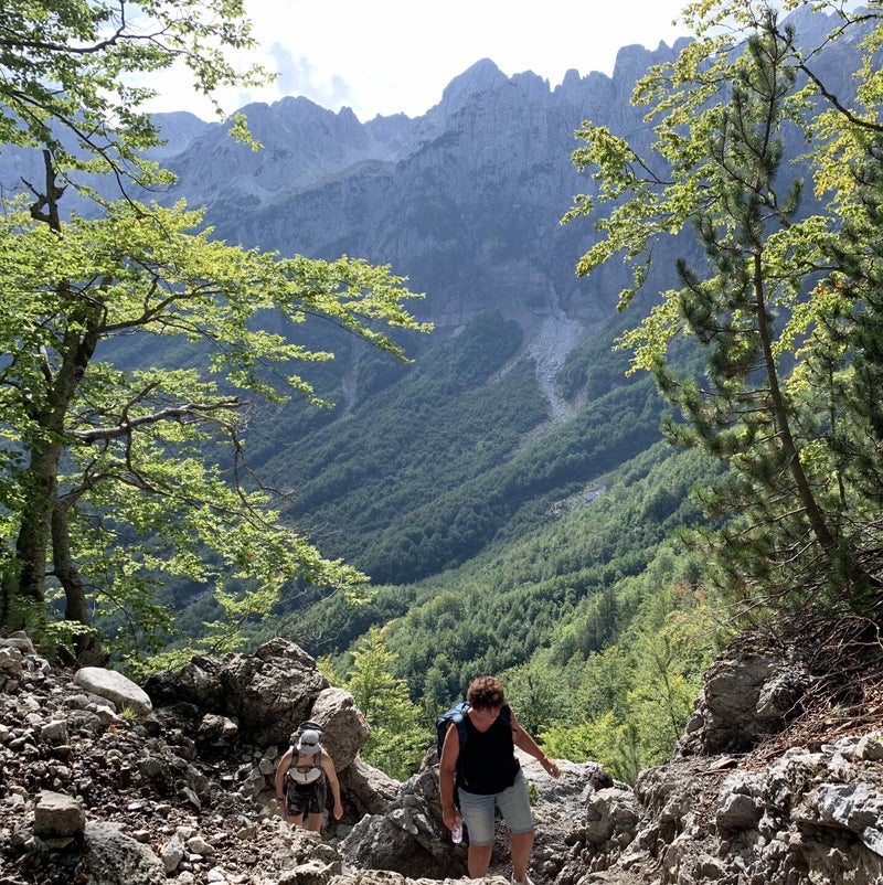 Het eerste stuk vanaf Valbone loop je door open terrein, dat redelijk gelijkmatig omhoog gaat. Het tweede gedeelte naar Theth gaat behoorlijk steil naar beneden, door bebost gebied. Het is een behoorlijke aanslag op je kuiten, en je moet oppassen, dat je niet steeds naar onderen glijdt. Wanneer je de route andersom zou lopen, van Theth naar Valbone, kan dit 's morgens bij warm weer een voordeel zijn. Het bos geeft verkoeling, want je loopt niet in de zon. Waar je dan wel aan moet denken, is dat je dan een flinke klim hebt, omdat het veel steiler is. Dat was voor mij de reden om vanuit Valbone te starten.