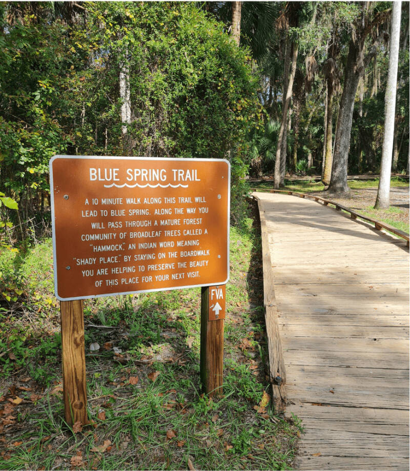 Wanneer we binnen zijn wandelen we eerst de Blue Spring Trail. Het planken pad loopt langs het water. Het heeft verschillende uitkijkpunten waar je vogels, aligators ( als je geluk hebt) en zeekoeien kunt zien,
