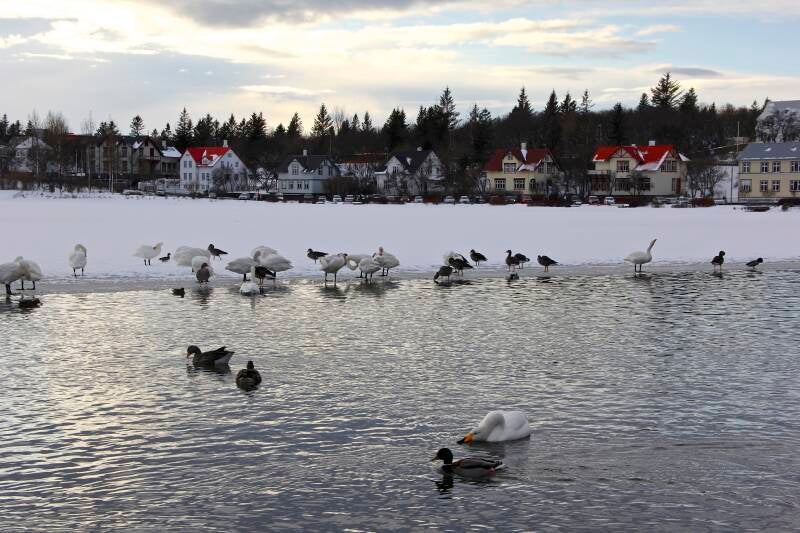Het Tjorninmeer is een klein ondiep meer in het centrum van Reykjavik. De belangrijkste gebouwen, zoals het Stadhuis, The National Gallery, de Amerikaanse Ambassade, en nog een aantal instellingen, liggen aan dit meer. Maar wat vooral heel leuk is, zijn de eenden, zwanen en ganzen die er wonen. Men zegt dat hier veertig verschillende vogelsoorten leven! Vele families komen hier eendjes voeren, en men noemt het daarom ook wel " de grootste broodsoep ter wereld" Het is er heel rustig, en we zijn tegen het eind van de middag. De zon schijnt nog een beetje, en ik vind het prachtig. Als je even lekker wilt uitwaaien, dan is dit een perfecte plek.
