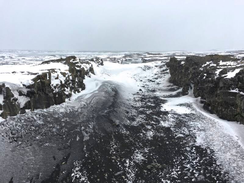 Als wij aankomen is het water bevroren en ligt het vol sneeuw. Eigenlijk had ik gehoopt dat het water niet bevroren zou zijn. Toch is het een bijzondere ervaring om op deze manier in de krater zelf te staan. Een lange trap leidt je naar het meer beneden. Deze is nu spekglad, dus we glibberen behoorlijk snel naar onderen. Als je de Golden Circle rijdt is het echt wel de moeite om deze extra stop in te lassen.