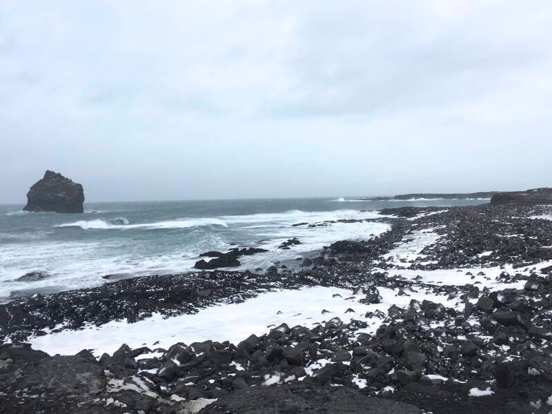 Het is maar een klein half uur rijden naar Reynisfjara Beach. Ringweg 1 is een makkelijke weg om te rijden, gewoon recht toe recht aan. Er is bijna geen verkeer, en daardoor kunnen we lekker doorkachelen. De Hyundai is een fijne auto, Floor en ik zijn er zeer tevreden over. Door de brede winterbanden ervaren we geen problemen, wanneer een parkeerplaats vol sneeuw ligt, of als er stukken ijs op de weg liggen. Een veilig gevoel. Toch durven we het smalle weggetje naar het Dyrholeay uitzichtpunt niet aan. De weg is officieel afgesloten, en we besluiten om dit te bewaren voor een volgende keer. Dan maar meteen door naar het zwarte strand van Reynisfjara Beach.