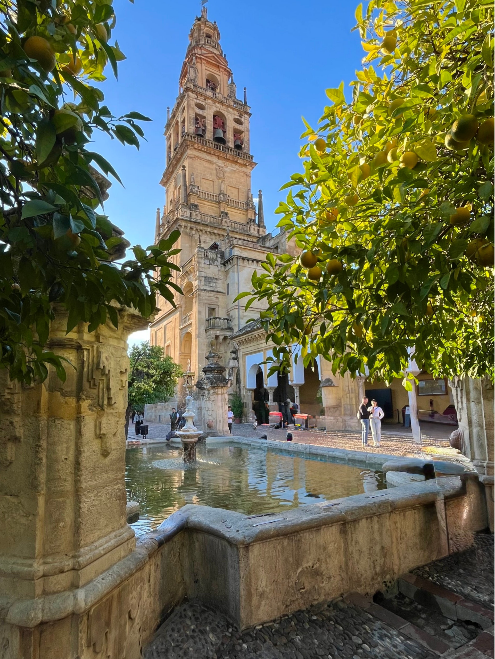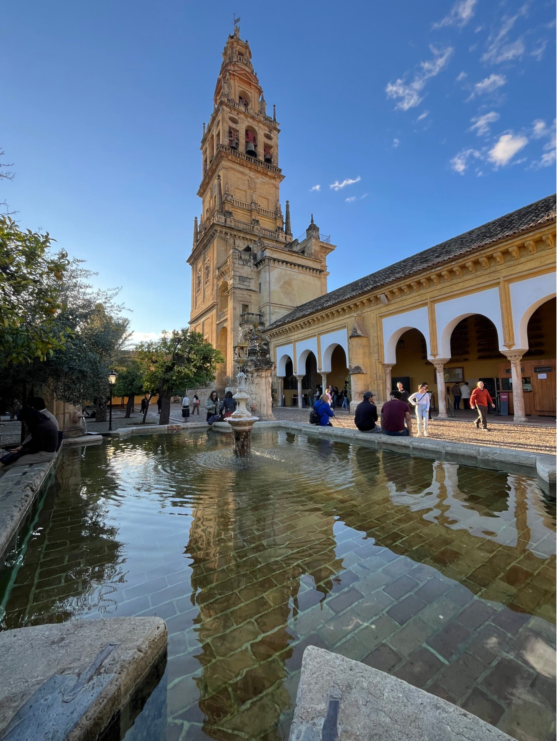 De meest bekende patio vindt je bij de Mezquita. De Patio de los Naranjos is de historische binnenplaats die hoort bij de Mezquita–Catedral de Córdoba, de beroemde moskee-kathedraal van Córdoba. Het staat helemaal vol met sinaasappelboompjes en het ruikt er heerlijk. Het betekent letterlijk “Hof van de sinaasappelbomen” — het verwijst naar de ongeveer 98 sinaasappelbomen die daar keurig in rijtjes geplant staan.
