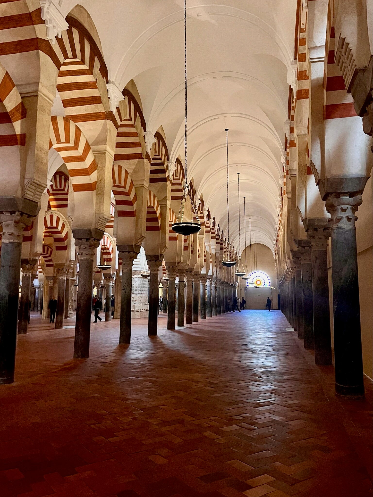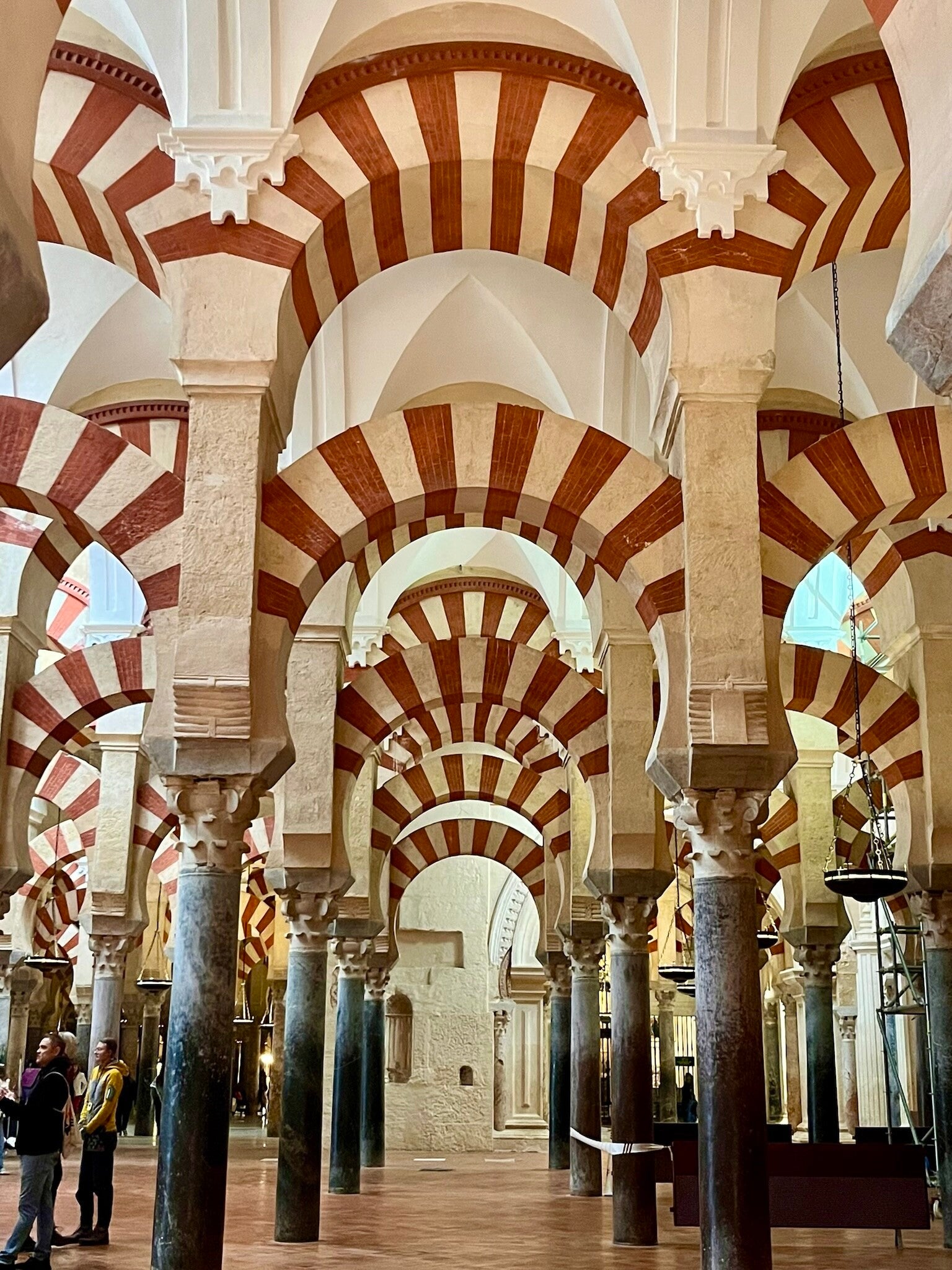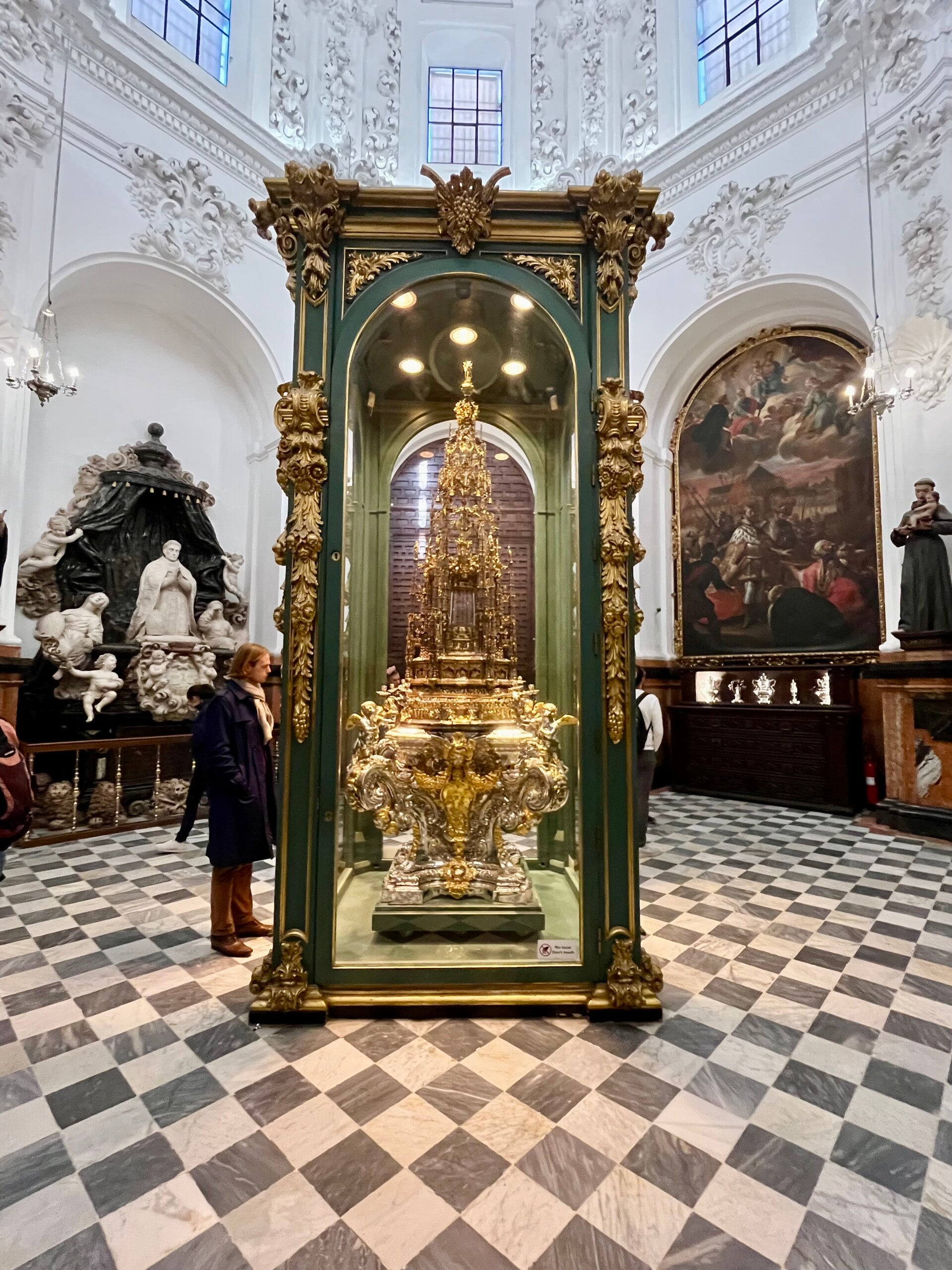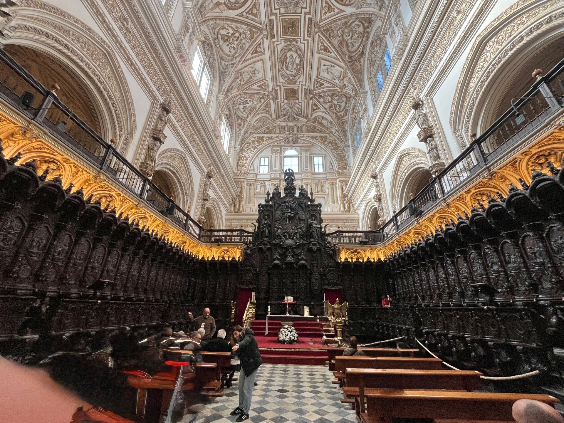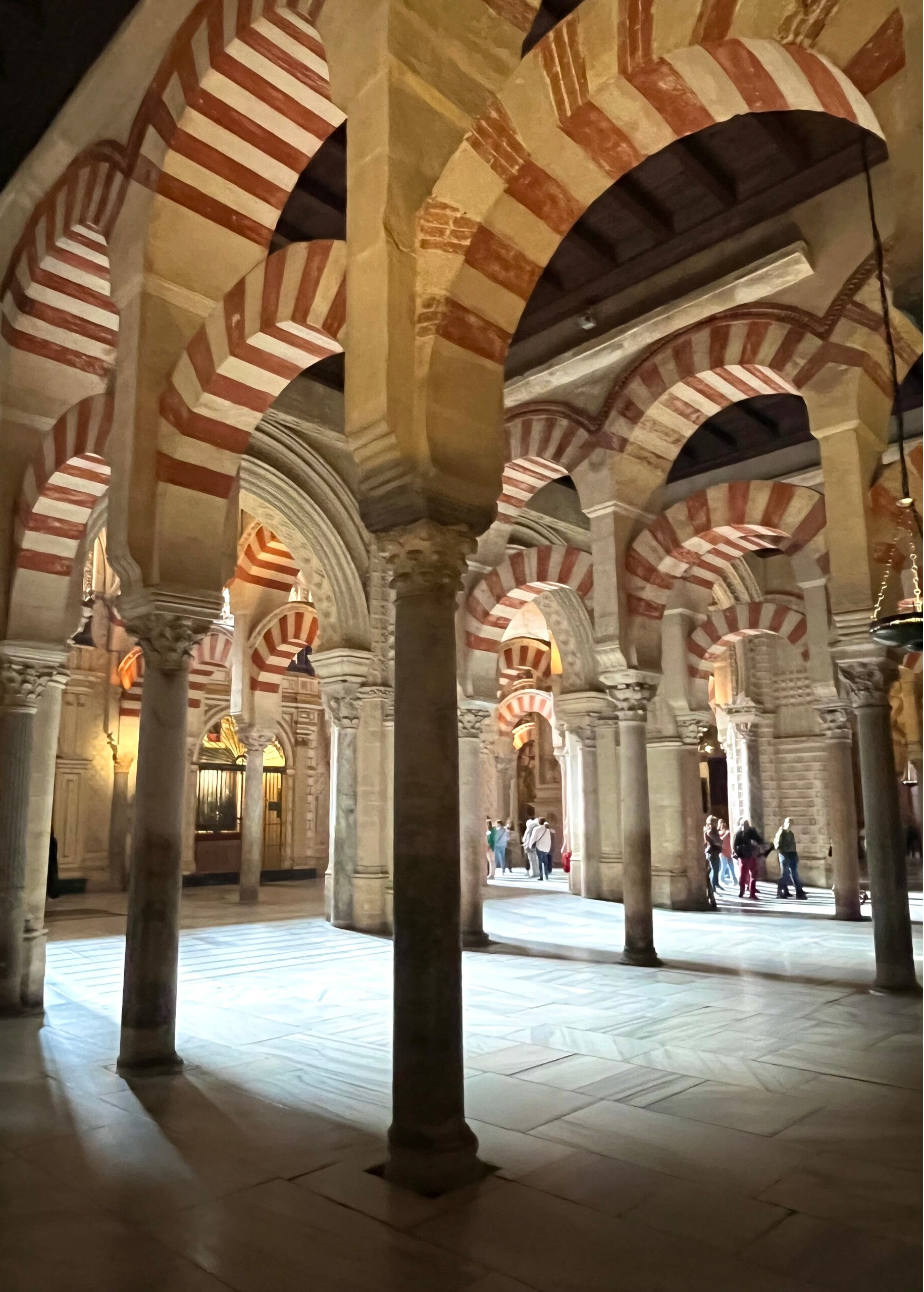 Terwijl je tussen de honderden zuilen doorloopt, merk je hoe het licht continu veranderd tussen de zuilen en dat is zo mooi! Bijna sereen. En dan opeens, alsof je in een ander gebouw bent gestapt, sta je in de rijke barokke kapel van de kathedraal zelf — vol houtsnijwerk, goudaccenten en imposante ornamenten. Bizar wat men in de oudheid al kon maken.