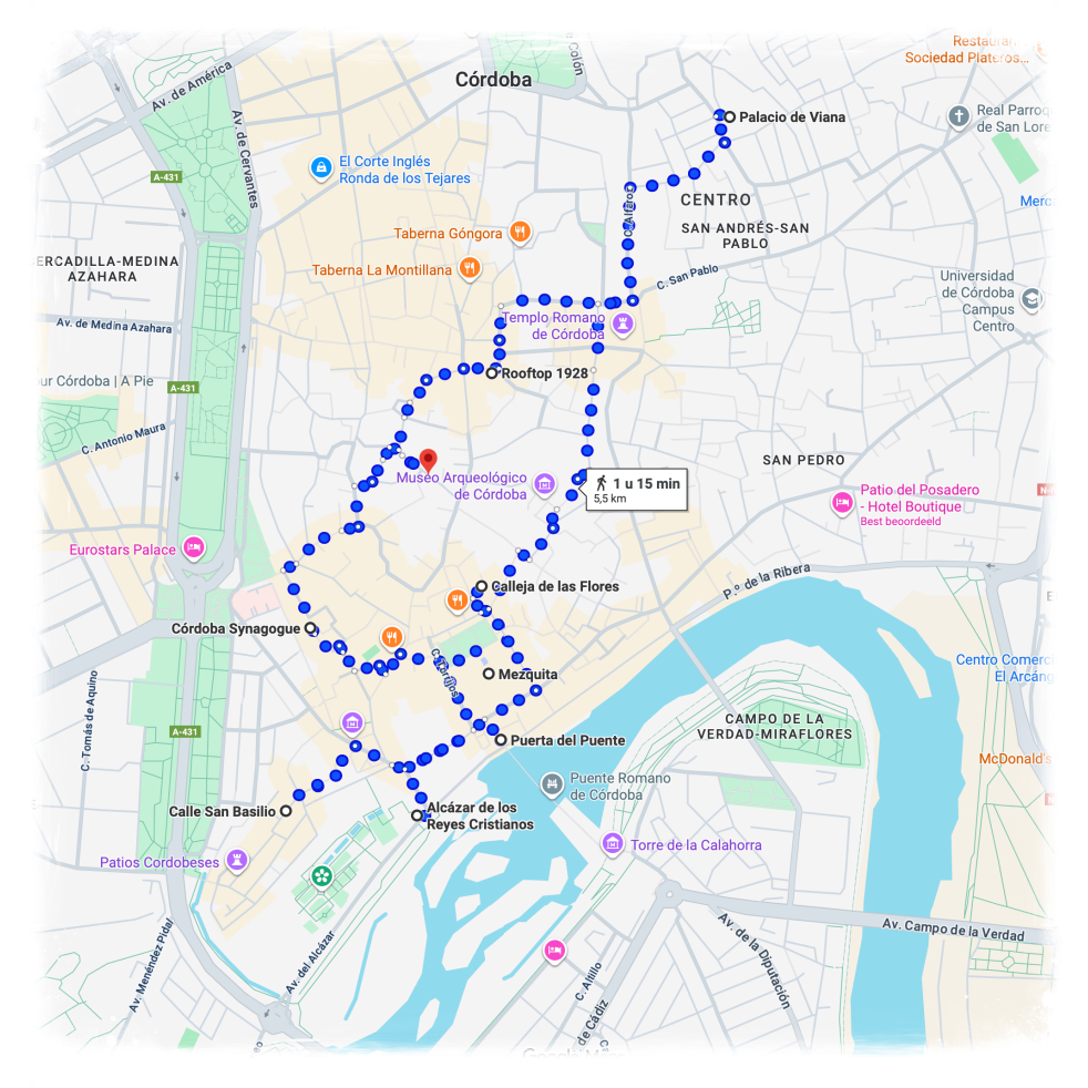 Om het een beetje logisch te bewandelen heb ik zelf een kaartje gemaakt. We kunnen zelf bepalen waar we stoppen of wat toch niet zo leuk is. En...niet geheel onbelangrijk, pauzeren op een van de vele gezellige terrasjes die in Cordoba te vinden zijn.