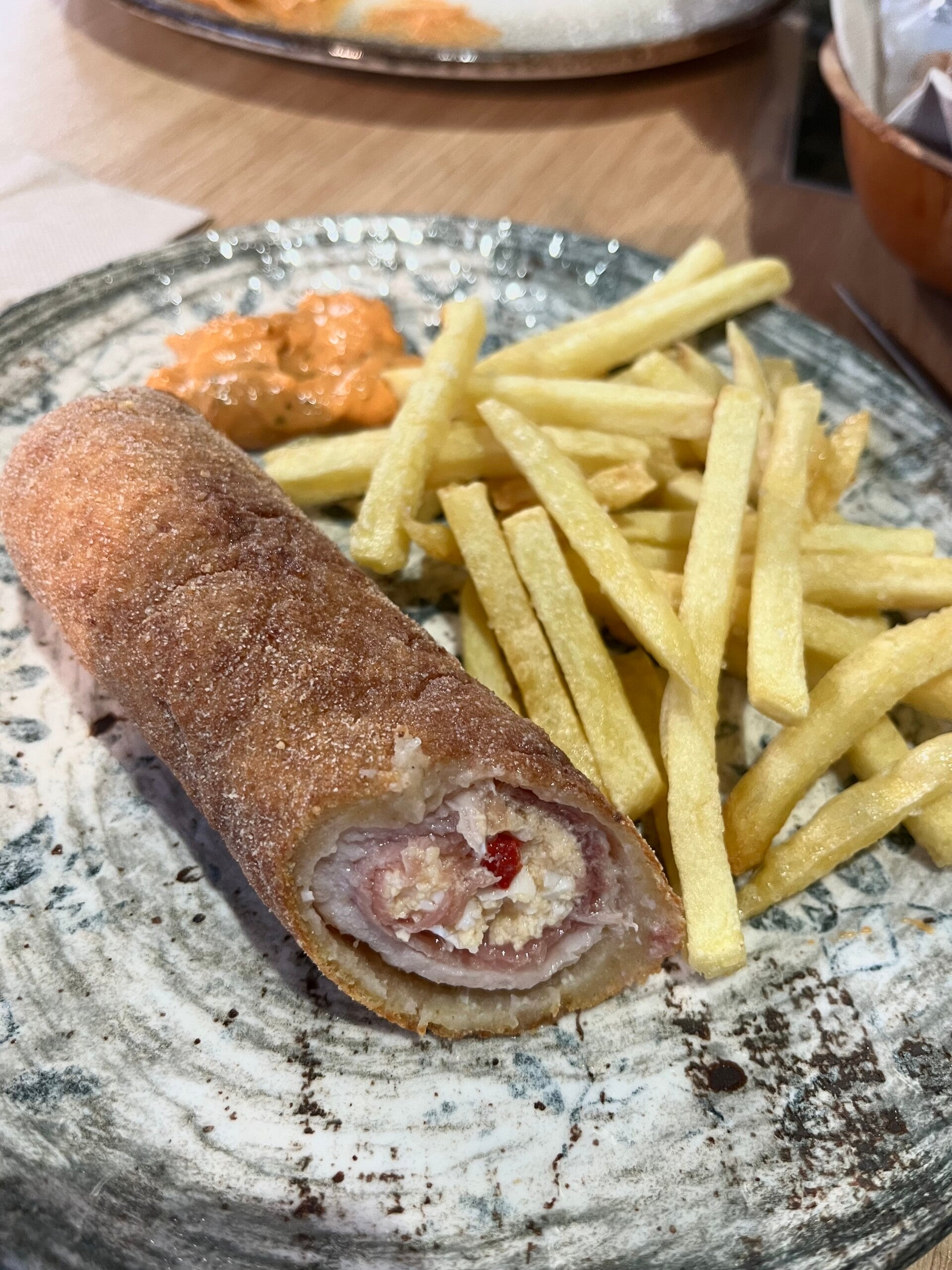We besluiten maar voor een late lunch te gaan vandaag, want echt gegeten hebben we nog niet. Op de kaart staat flamenquín. Een typisch Andalusisch gerecht dat je ook in Setenil de las Bodegas vaak vindt. Een flamenquín is een opgerolde rol van ham (meestal Jamón Serrano) gevuld met vlees of kaas, die vervolgens wordt gepaneerd en gefrituurd. Van buiten lijkt het op een langwerpige krokante rol en we krijgen het met frietjes geserveerd. Het smaakt heerlijk en we weten nu al dat we vanavond niet veel meer eten, want we zitten daarna stampvol.