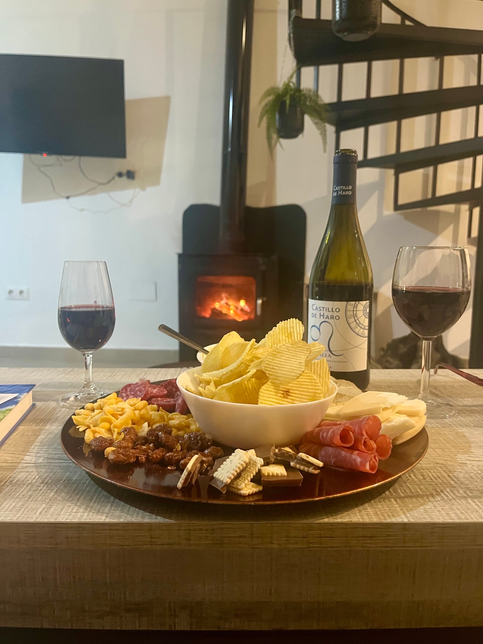 We maken het ons vanavond makkelijk in onze grotwoning. Het is november en absoluut niet koud of vochtig in het huisje. Met een hapje en een drankje voor de kachel sluiten we deze super leuke dag af in Setenil de Las Bodegas.