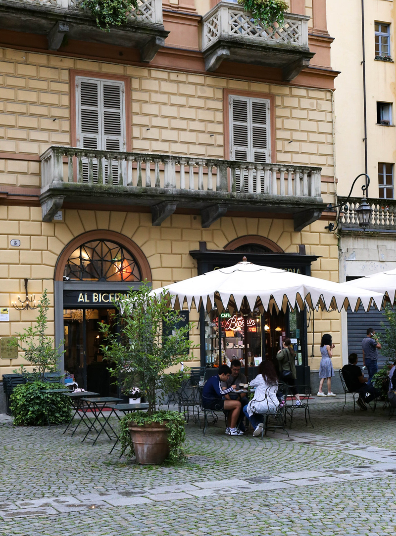 We krijgen ondertussen wel zin in koffie en natuurlijk doen we dat bij Caffé Al Bicerin. We slenteren langs terrasjes en door mooie straatjes en zijn het erover eens dat Turijn heel sfeervol is.