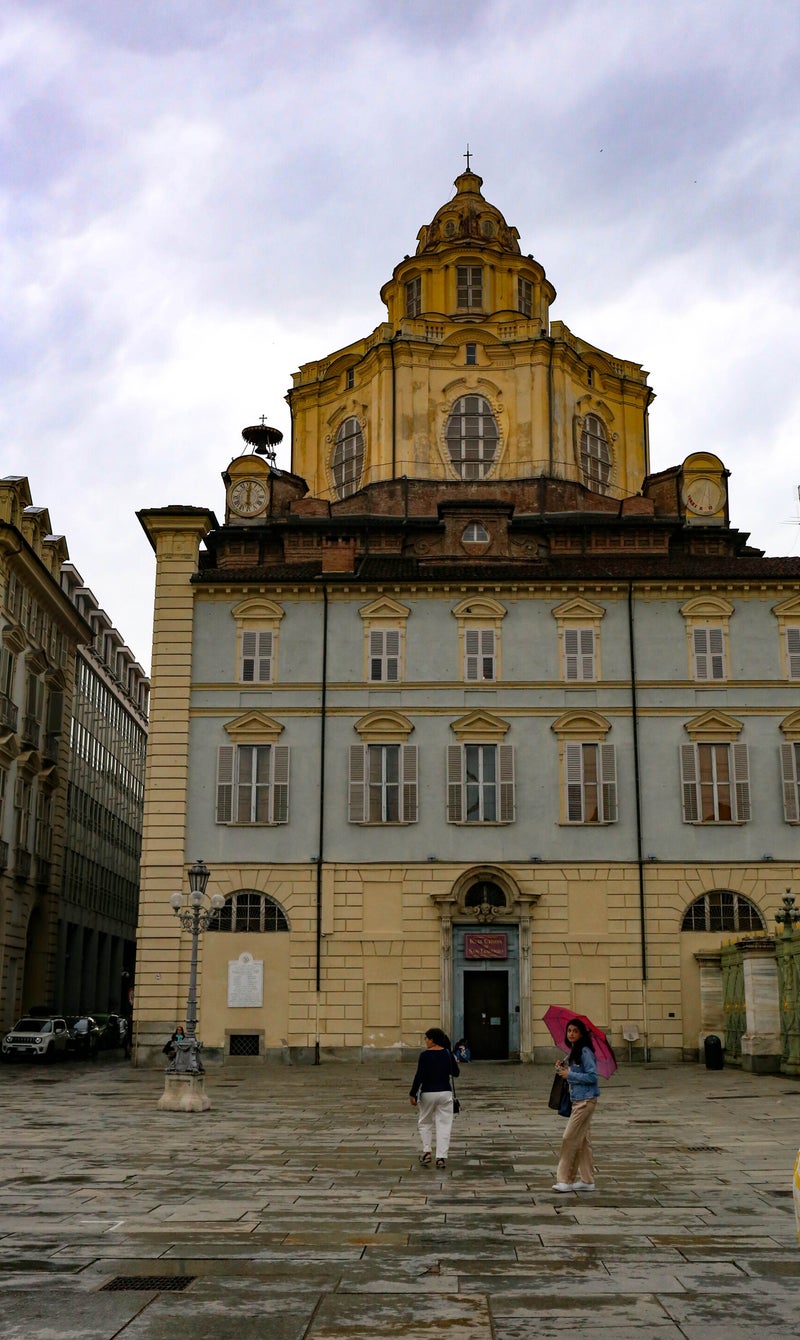 Via de binnenplaats van het Palazo Real kom je bij de Kathedraal van Turijn uit. Ze valt wel een beetje in het niet met de achtergelegen toren van het Palazzo Real