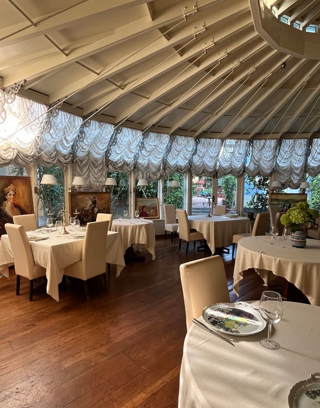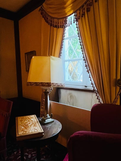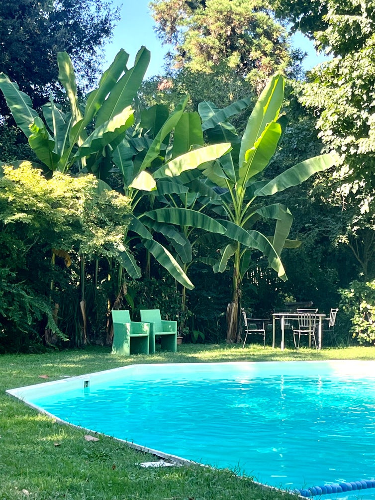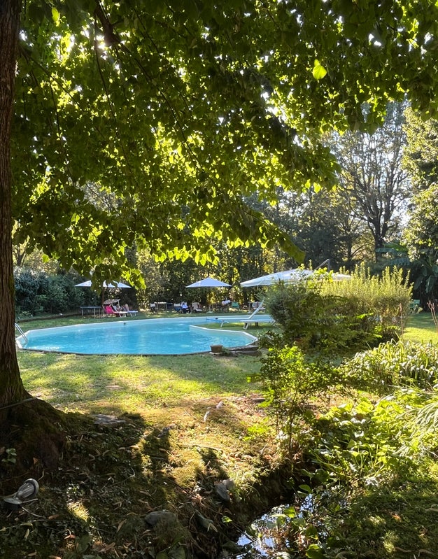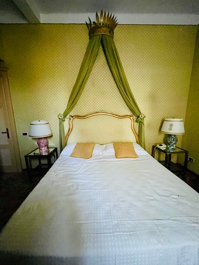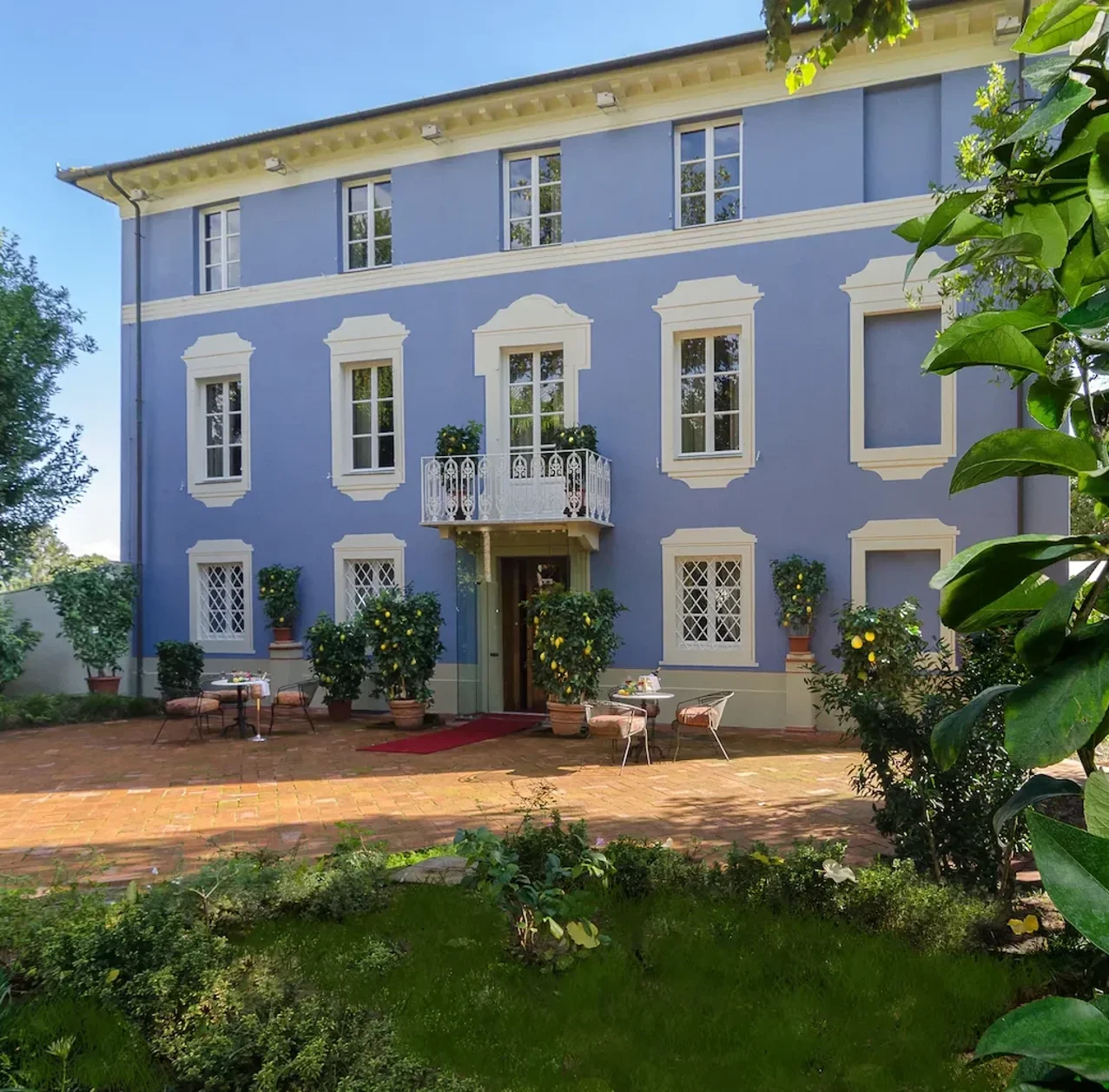 Vanaf het vliegveld is het een uurtje rijden naar Lucca, waar we overnachten in de groene heuvels net buiten de stad. Ik heb een kamer geboekt bij Resort dei Limoni, en bij aankomst stappen we meteen een ander tijdperk binnen. Waanzinnig. Het poederblauwe historische pand was ooit eigendom van Napoleons zus. Het heeft een rijke geschiedenis en unieke architectuur. Binnen ervaar je een throughback naar deze tijd, maar met een moderne touch.