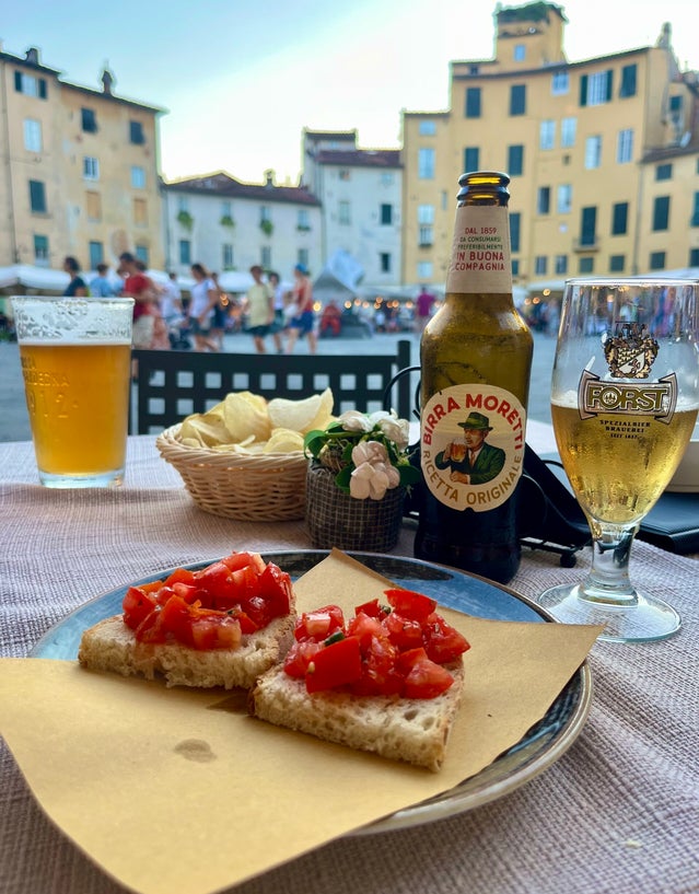 Over mooie pleintjes en straatjes gesproken, het allermooiste plein van Lucca is het Piazza dell’ Anfiteatro. Via een kleine poort kom je op het schitterende ovalen plein uit. Wat een gezelligheid! We besluiten hier meteen te gaan zitten voor een avondje vermaak en lekker eten. Denk nou niet meteen, dat je de hoofdprijs betaald op deze trekpleister, want de prijzen vallen reuze mee voor een hapje en een drankje.