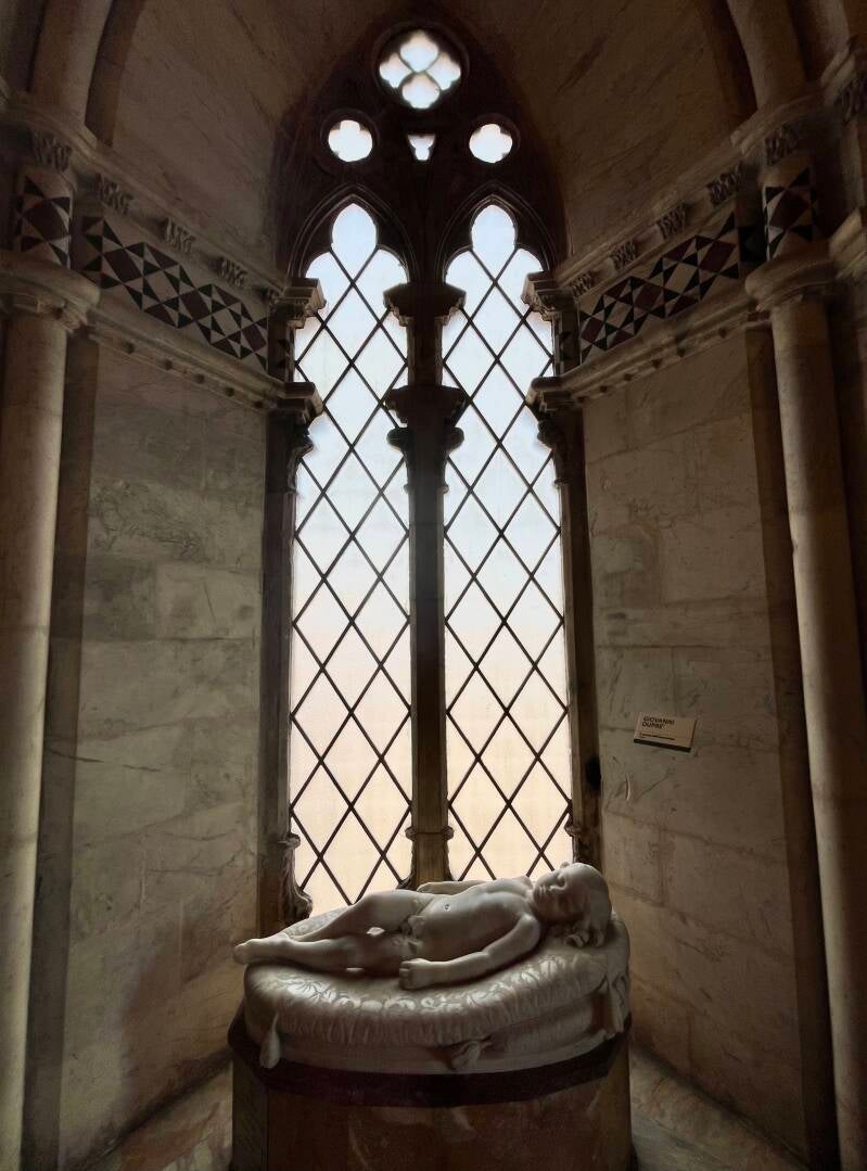 Nadat we het uitzicht over de stad hebben bewondert lopen we naar beneden, naar de begane grond. Hier vind je de mooiste sculpturen van de voorgevel van de Kathedraal. De witte beelden schitteren in de donkere ruimte. Veel van de beelden en decoraties die je nu in de kathedraal ziet, zijn kopieën. Ik vind het geweldig.
